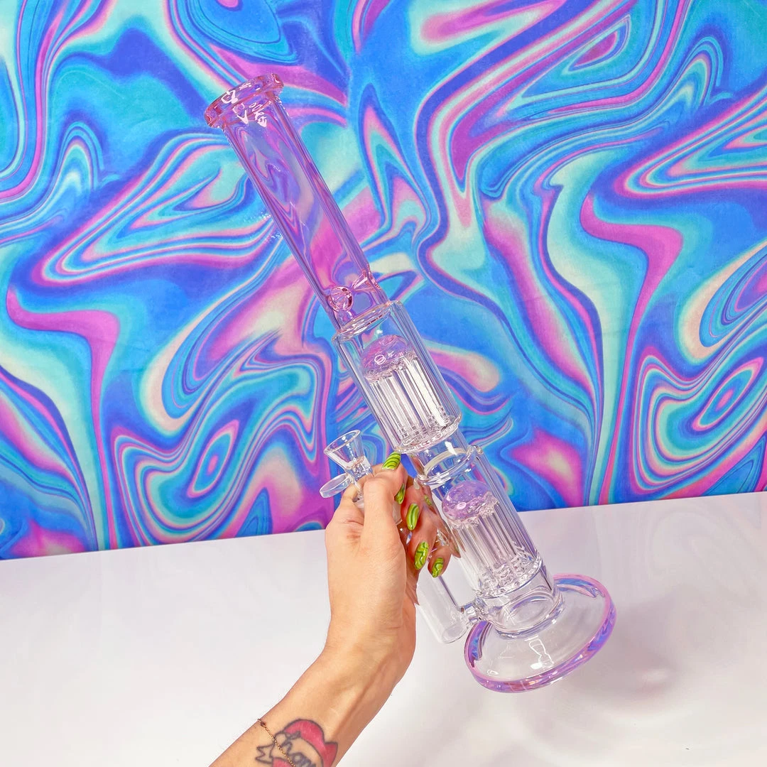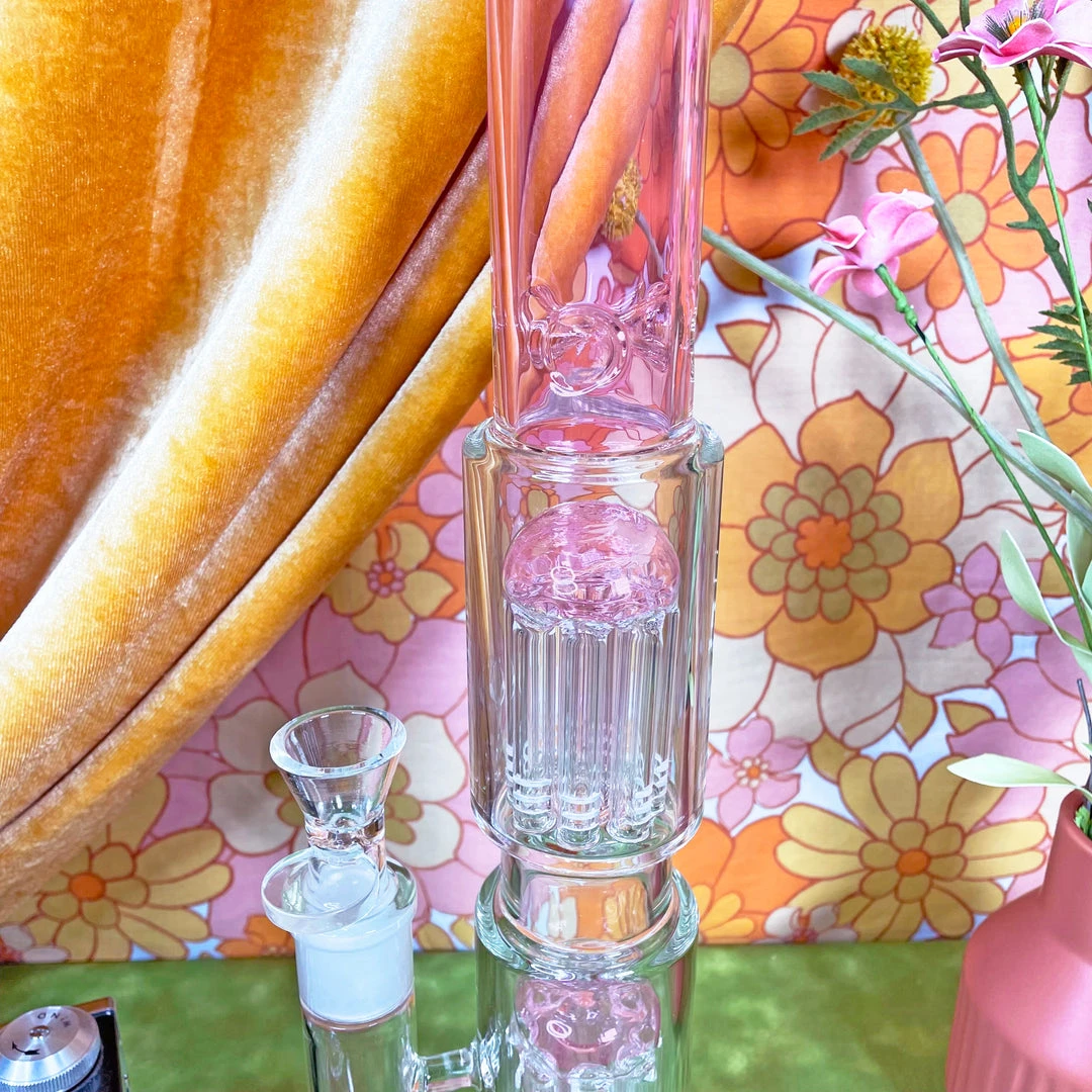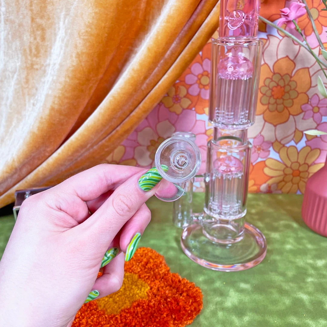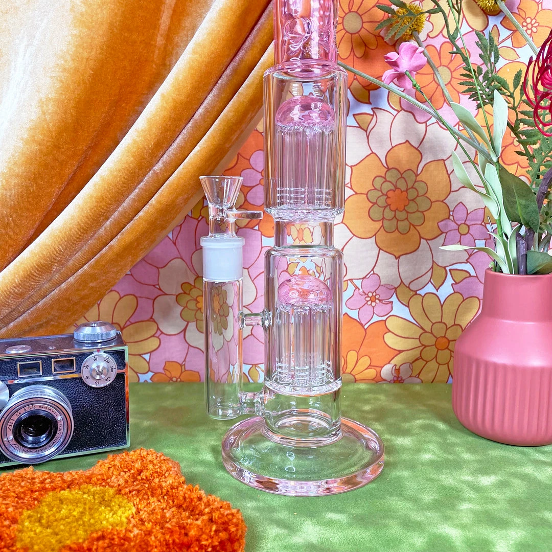 15″ tall, this piece has everything you could ever want- ash catcher, ice catcher, 2 fancy percs and stuuuurdy base. Made of super heady glass. Comes with a 14mm quartz slide.