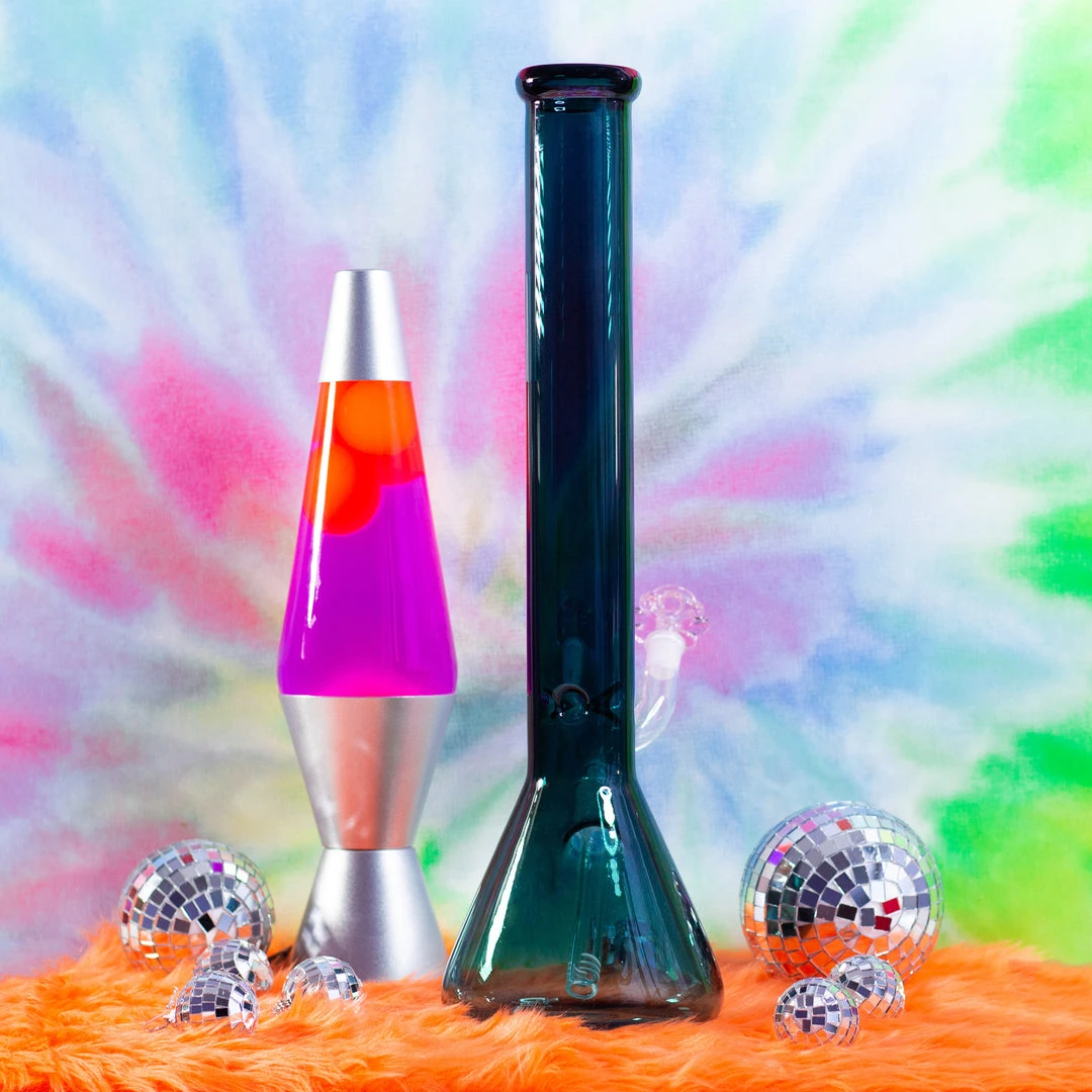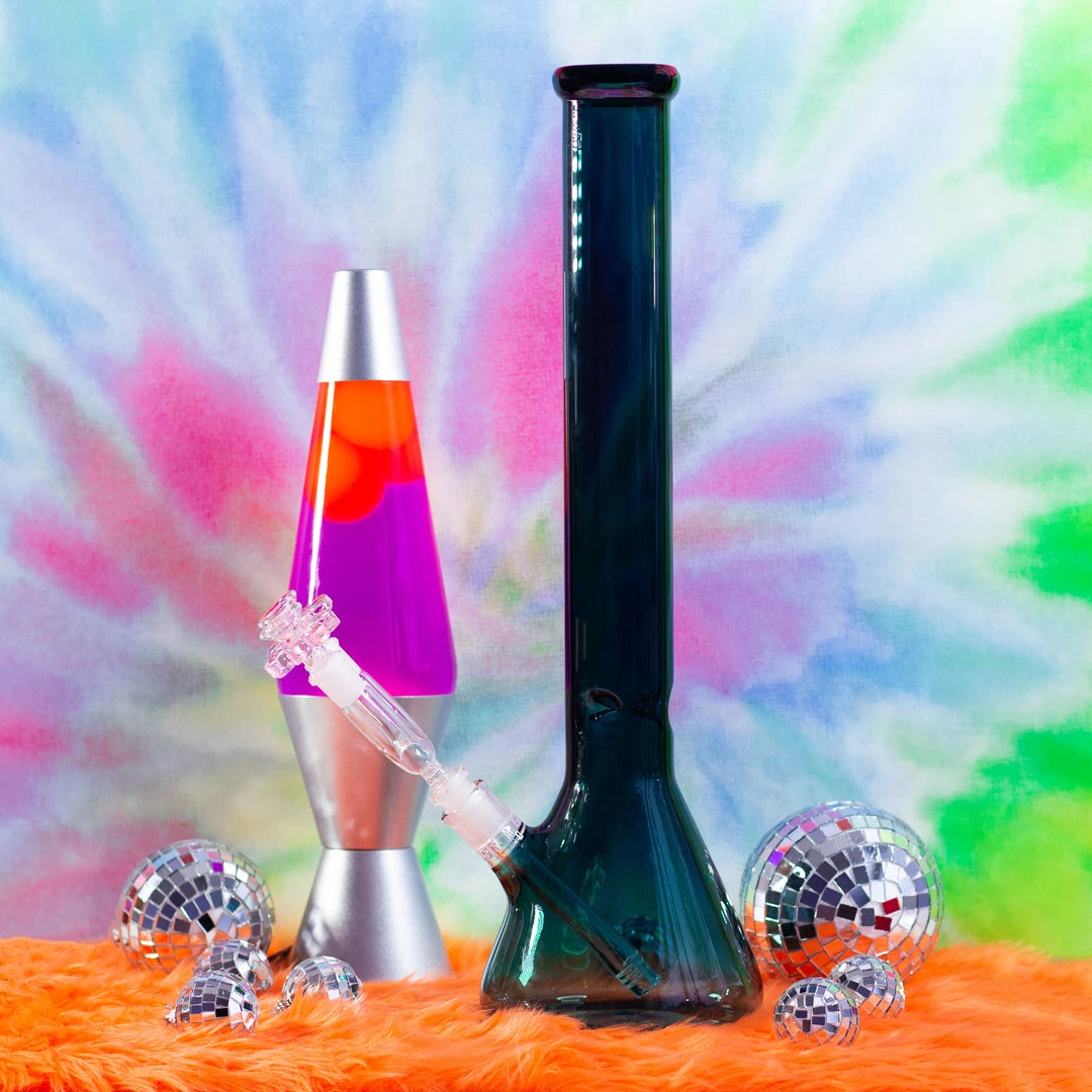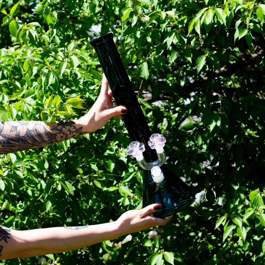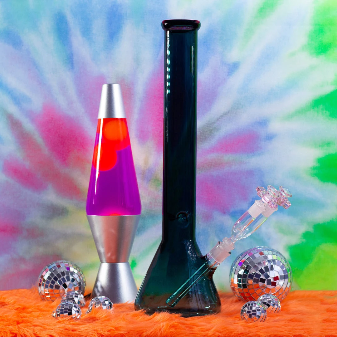 Probably overall the largest piece we have ever had! Features a huge beaker base (6″ wide) an extra wide mouthpiece and an ice catcher, this piece is going to get you high. Made entirely of teal glass. Downstem features an inline perc. Comes with an extra special split stem and TWO matching daisy slides so you can load up two bowls at once!