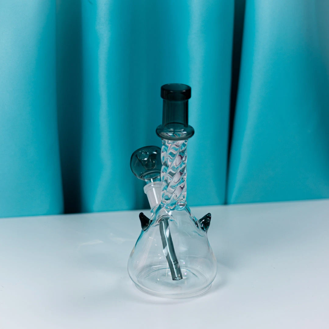 This bong features clear glass with teal accents. An elegant twist on the neck of the bong with teal grippies helps hold the pipe.