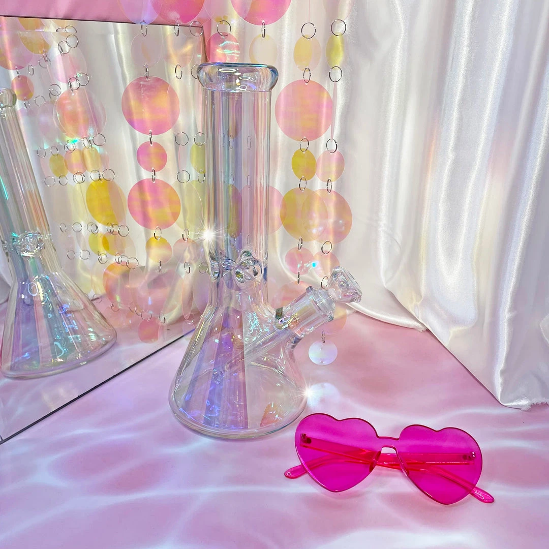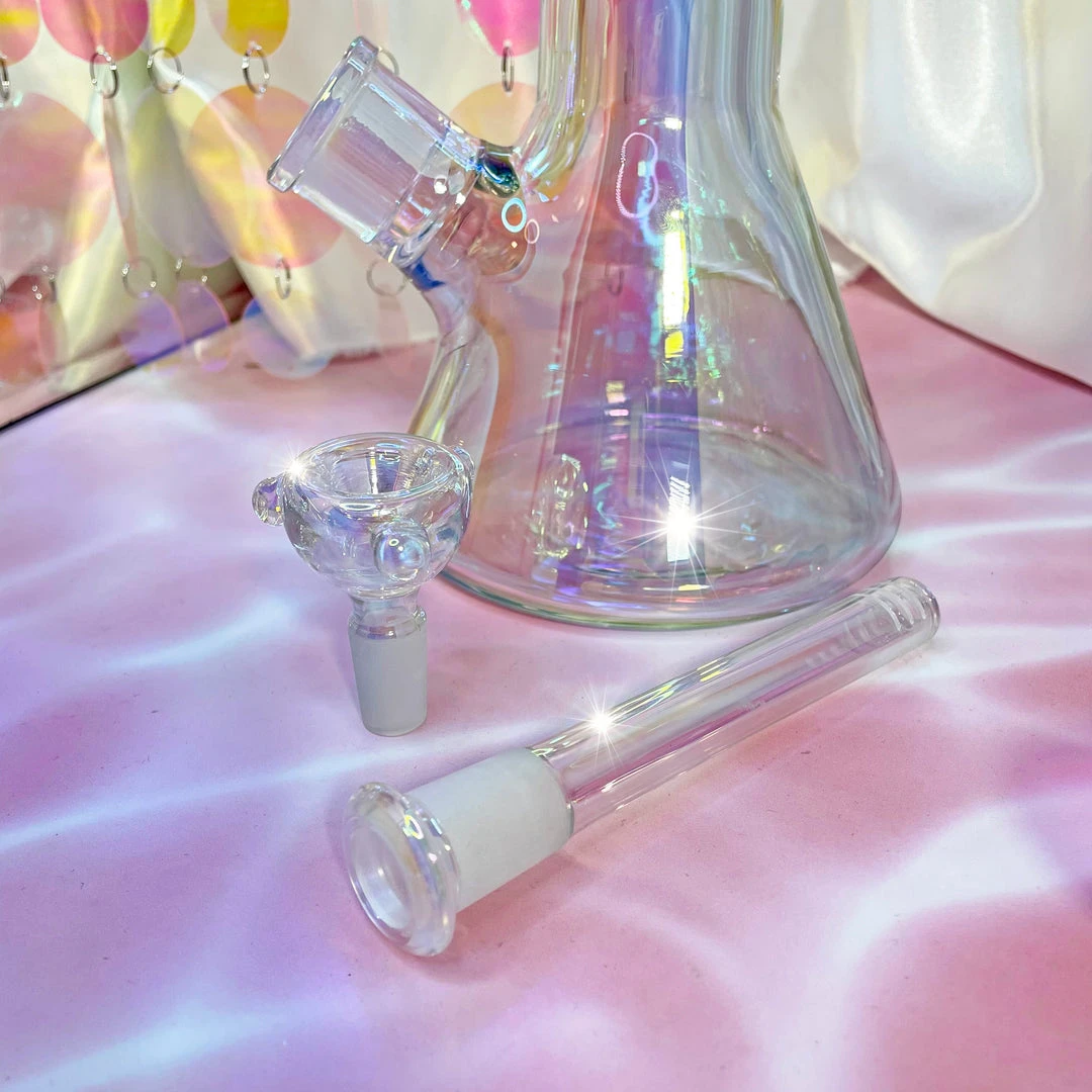 This bong is a stunner! I wish you could see her IRL. She’s completely covered in iridescence- the slide and downstem are iridescent too!Â
