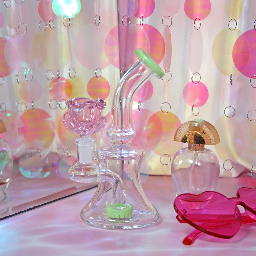 Blossom has an hourglass shaped smoke chamber. She’s got colored accents on the mouthpiece and perc. She even comes with a super special blossom slide!