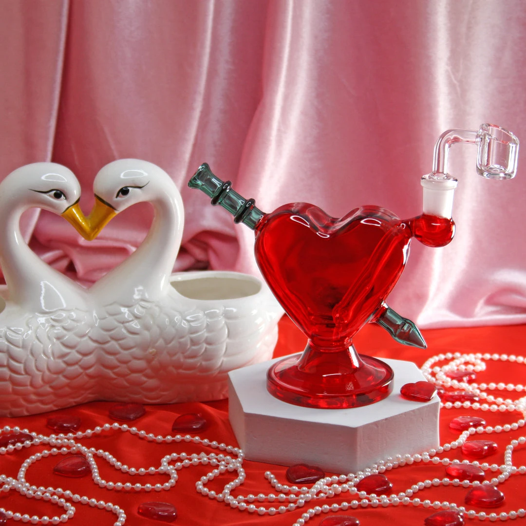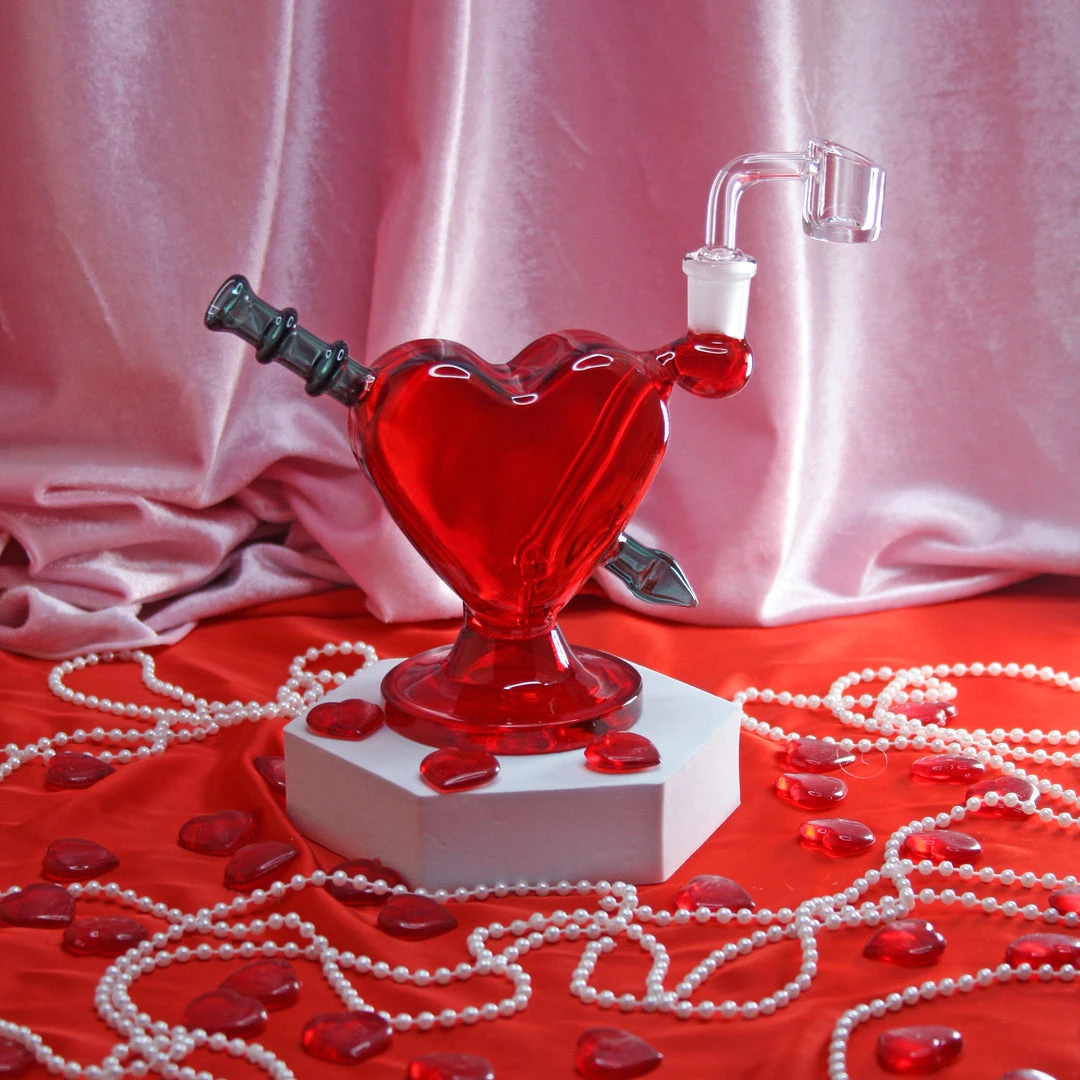 This piece measures 6″ x 6″ x 1.5″ and features red glass with a teal arrow piercing the heart. The arrow doubles as the mouthpiece.