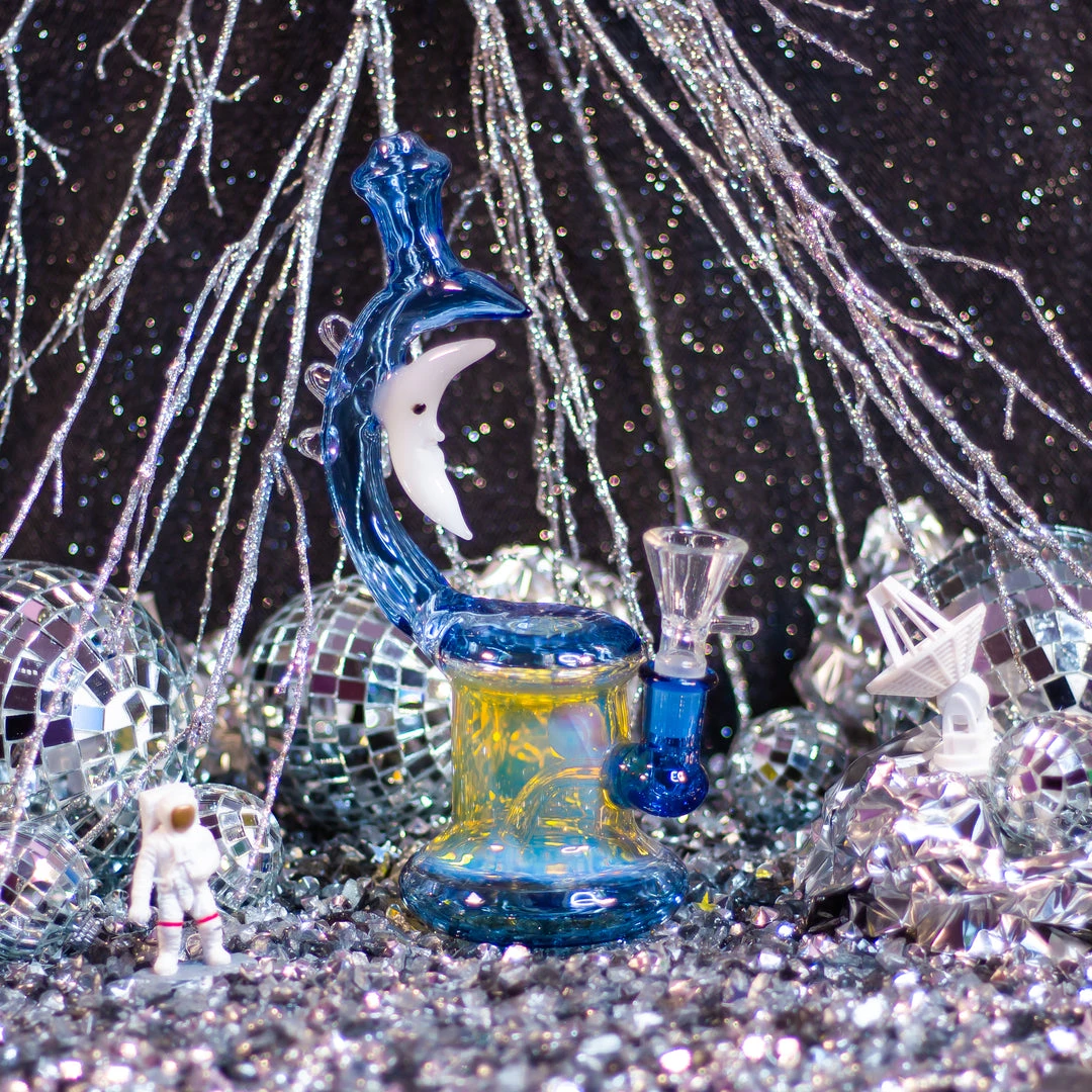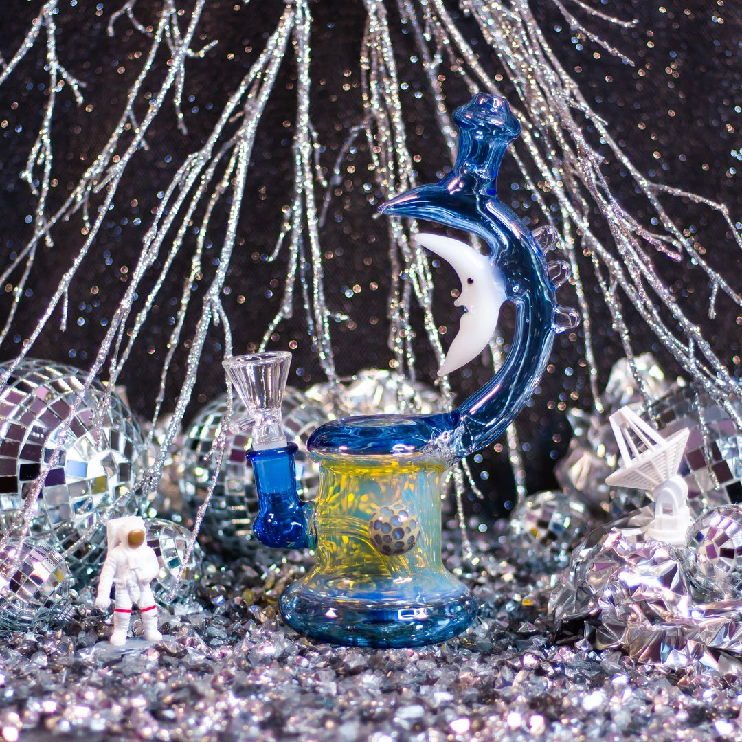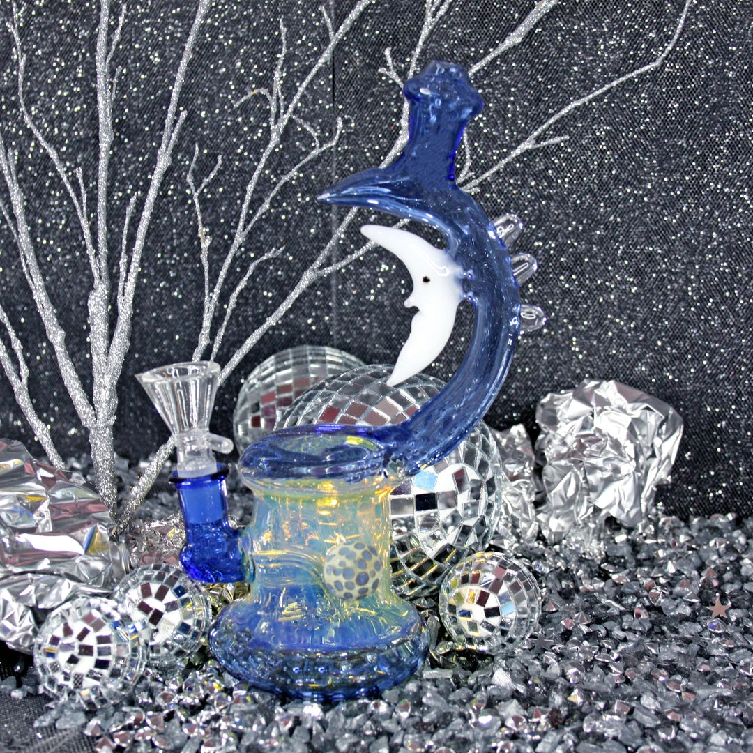 This bong measures 9″ tall. Comes with a clear funnel slide that has an ash catcher. A moon is suspended above the smoke chamber. It’s dreamy!