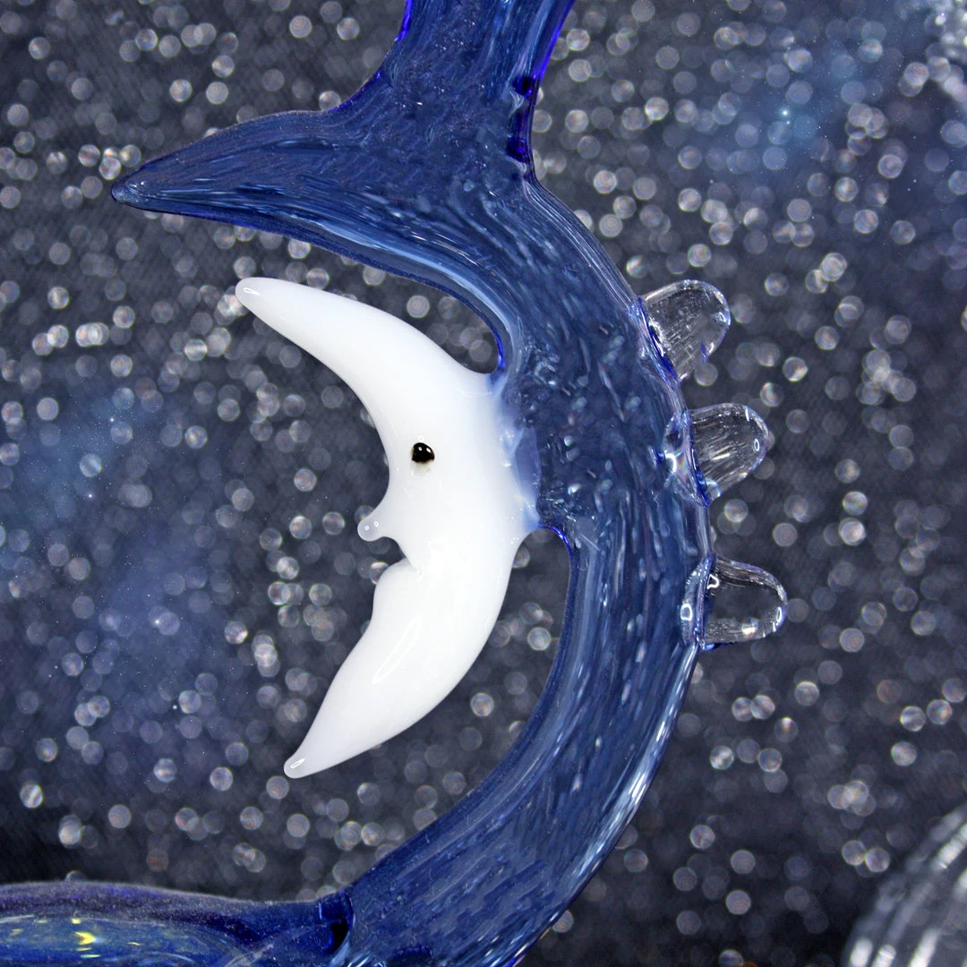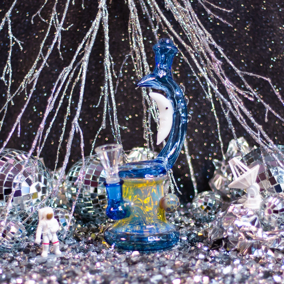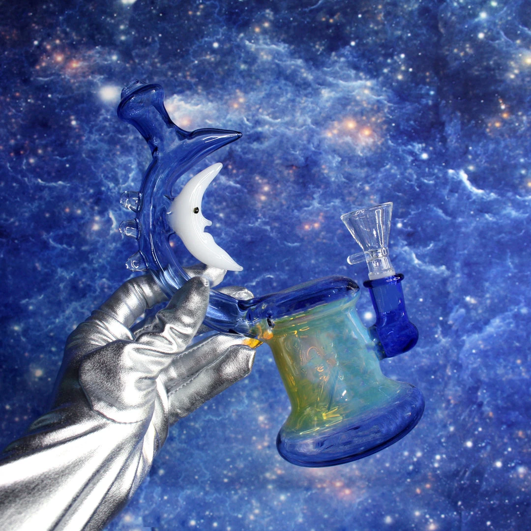 This bong measures 9″ tall. Comes with a clear funnel slide that has an ash catcher. A moon is suspended above the smoke chamber. It’s dreamy!