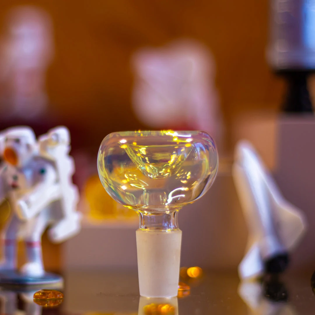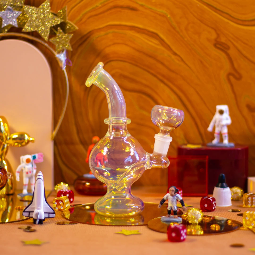 This piece is made of gorgeous gorgeous gold fumed glass. The slide matches the piece and even has an ash catcher. This piece is in a fun globe shape with a curved neck.