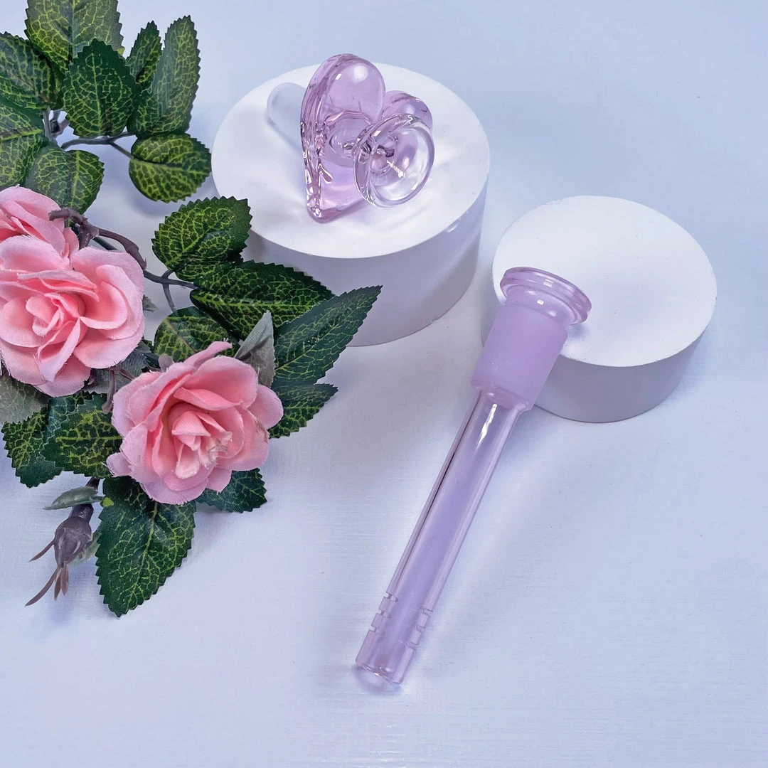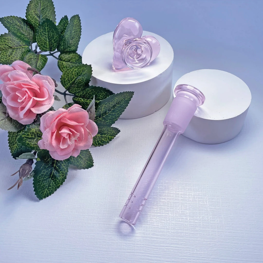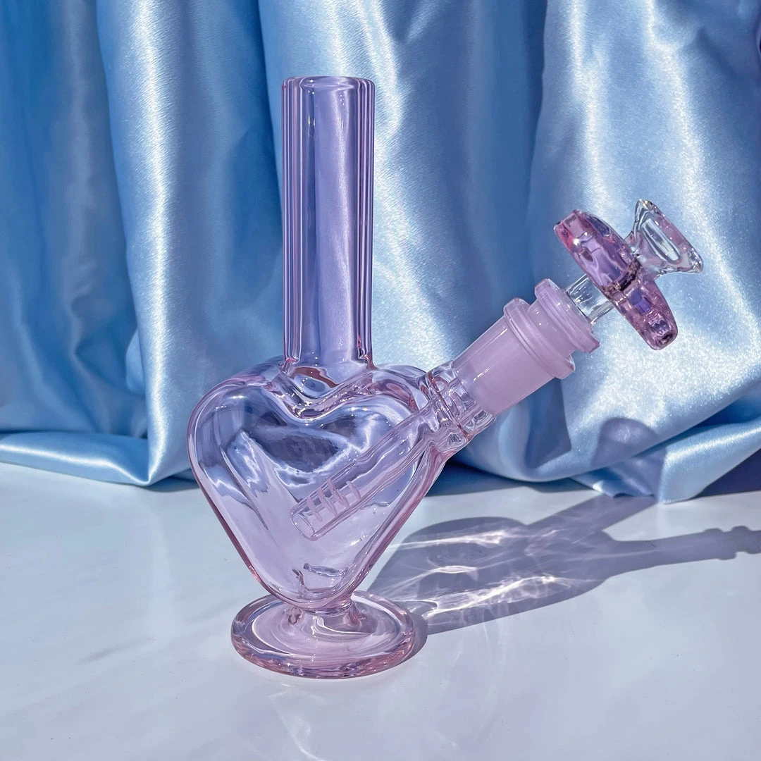 Made of thick borosilicate glass. 6.5″ tall. Made entirely of pink colored glass. Comes with a 14mm heart bowl.