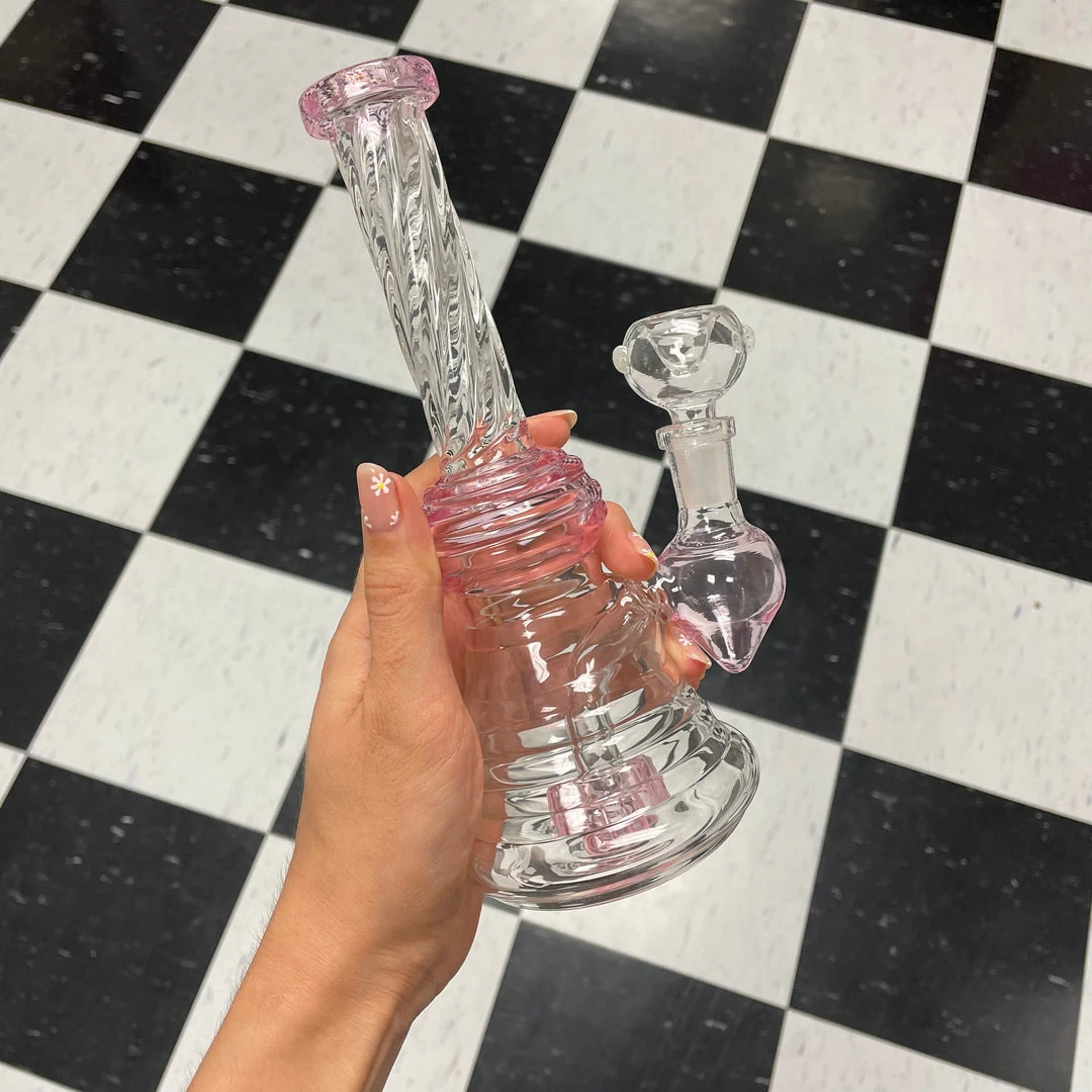This bong features clear glass with pink accents. This piece is very stable because of the cone-shaped base. And she has a pink ash catcher. A gorgeous piece!