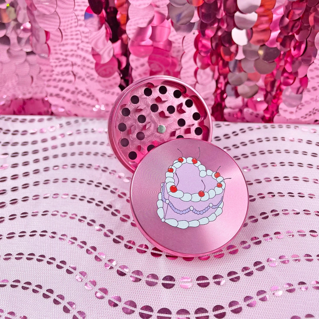 Metallic pink grinder features adorable heart-shaped cake art on top. Drawn by me, ofc, while eating cake in my bed aka “doing research”.