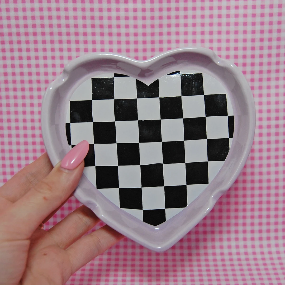 Designed by me, the girl writing this copy and taking these photos lol, this ash tray is hand crafted of substantial ceramic with a checkerboard print and a lavender border. Ash tray is handmade and will have minor flaws that make each one unique.