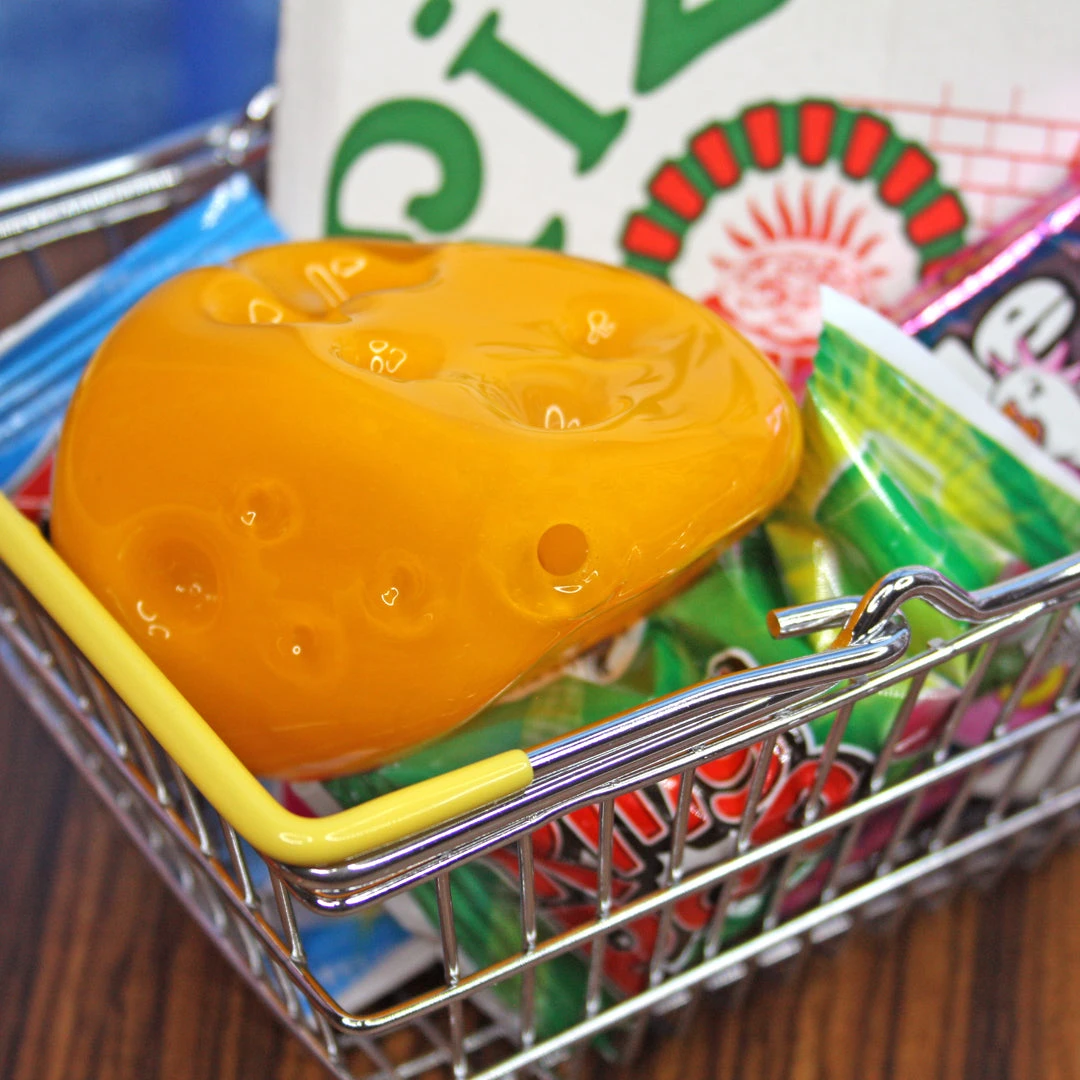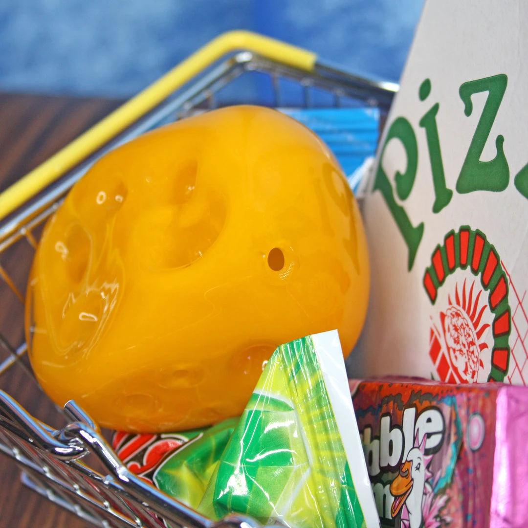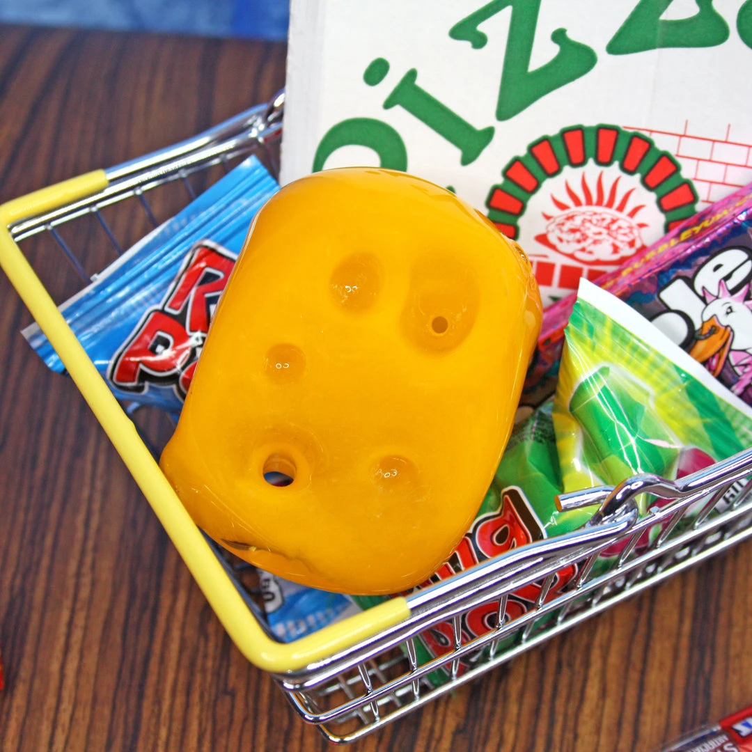 This cheese pipe is made in the US by Michael of Humble Pride Glass. It’s the perrrrrfect cheese color and has swiss cheese holes all over. One of those holes holds your herb. The mouthpiece is on the bottom left corner and the carb is behind the bowl.