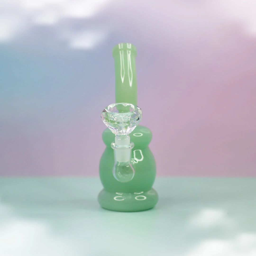 Made of jade milky glass, this piece is on the smaller side measuring 6.5″ tall. A curvy base makes for an easy grip. Has an inline perc and a curved neck. The best part is it comes with a matching jewel bowl that gives it that extra special touch <3