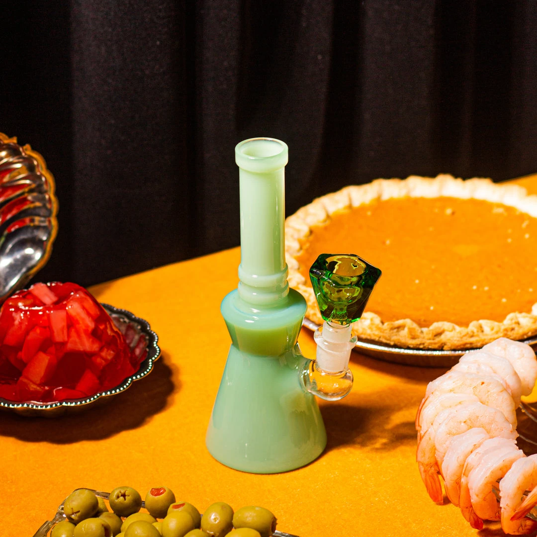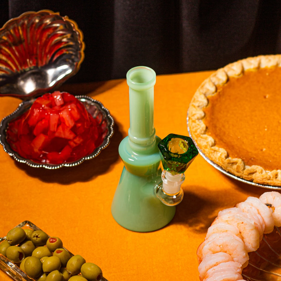 Made of jade milky glass, this piece is on the smaller side measuring 7″ tall. A conical base keeps this piece steady on any surface. The best part is it comes with an emerald colored jewel bowl that gives it that extra special touch <3