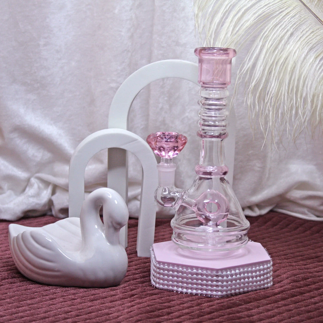 This water pipe has a wide base to keep it stable. A long neck made of pink glass makes each hit * extra * special. More accents of pink glass on the perc and neck and an ash catcher make this piece kayuuuute!