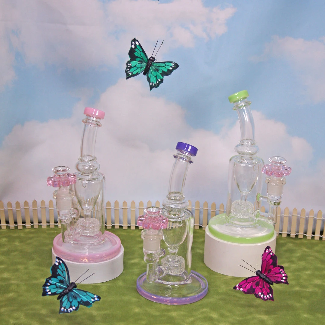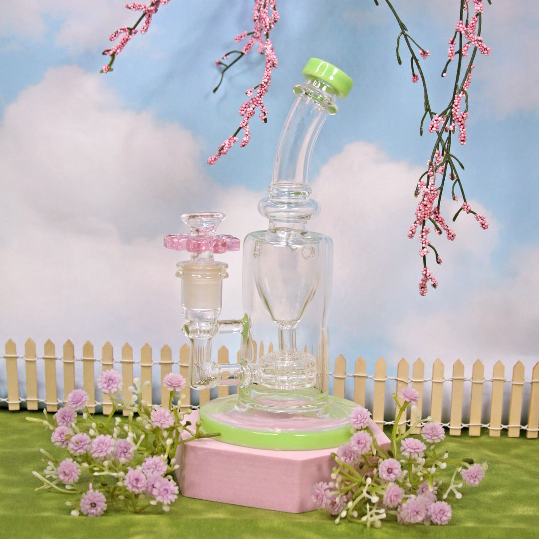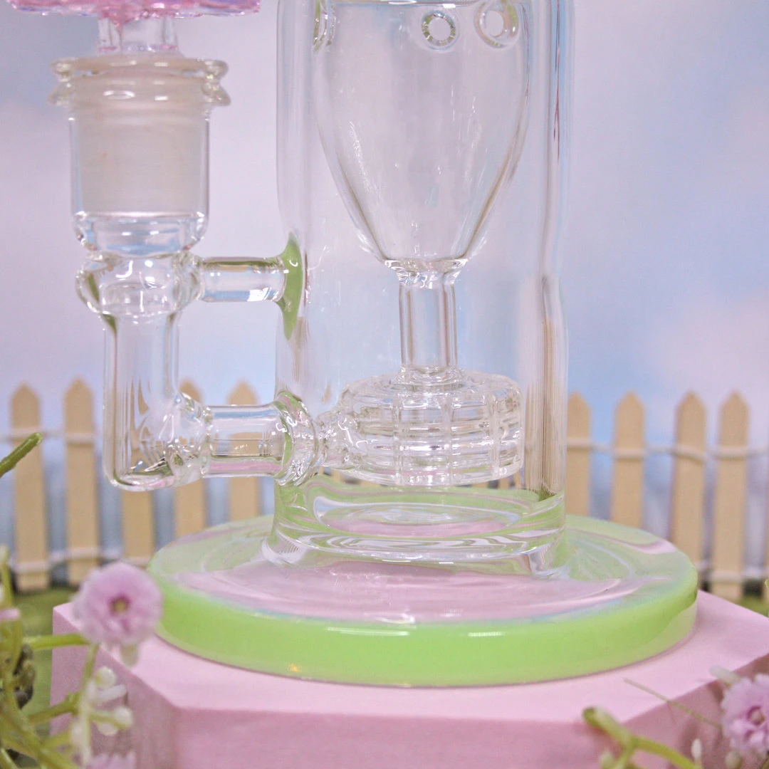 Your new bff measures 8″ and features pops of lavender glass. She’s got an ash catcher, a lil perc and a wide stable base. We even added a pink flower bowl because once we saw it we couldn’t unsee it!!