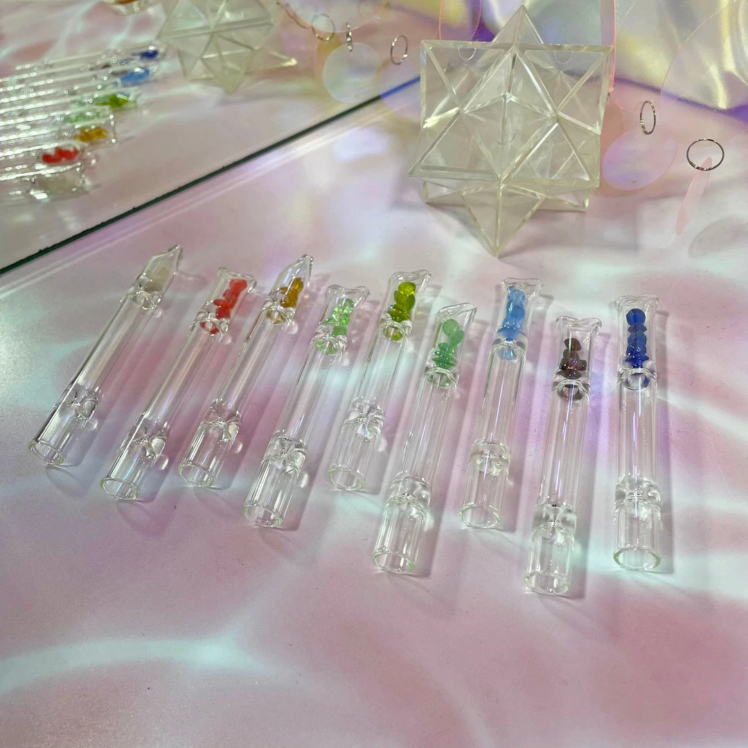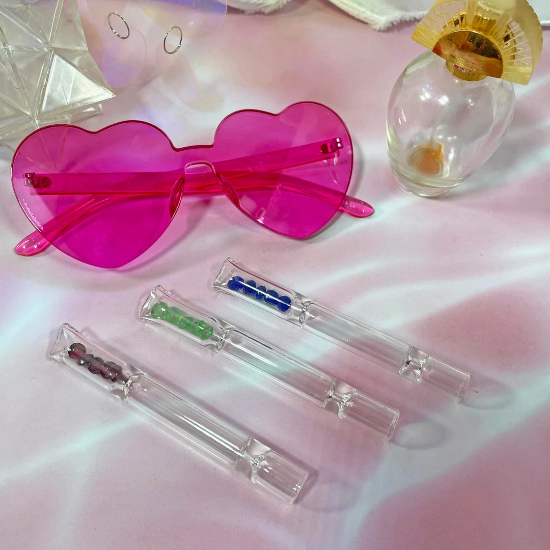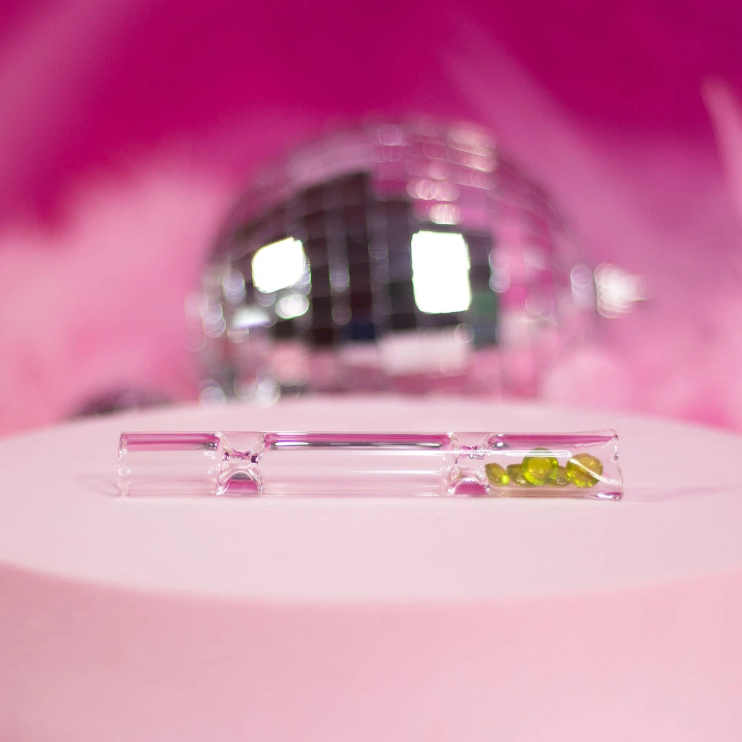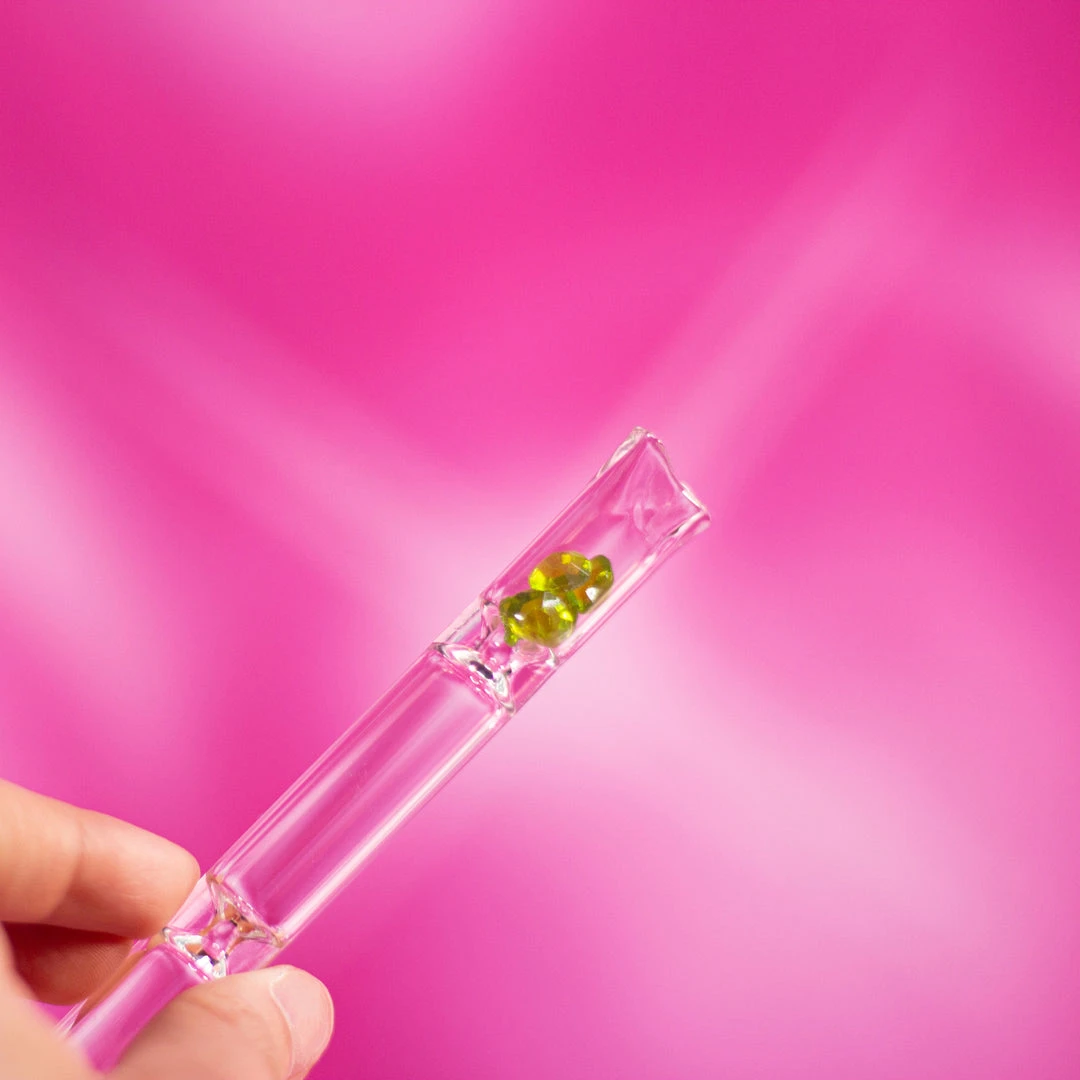 This piece is made of durable clear borosilicate glass and filled with gemstones that act as a filter.