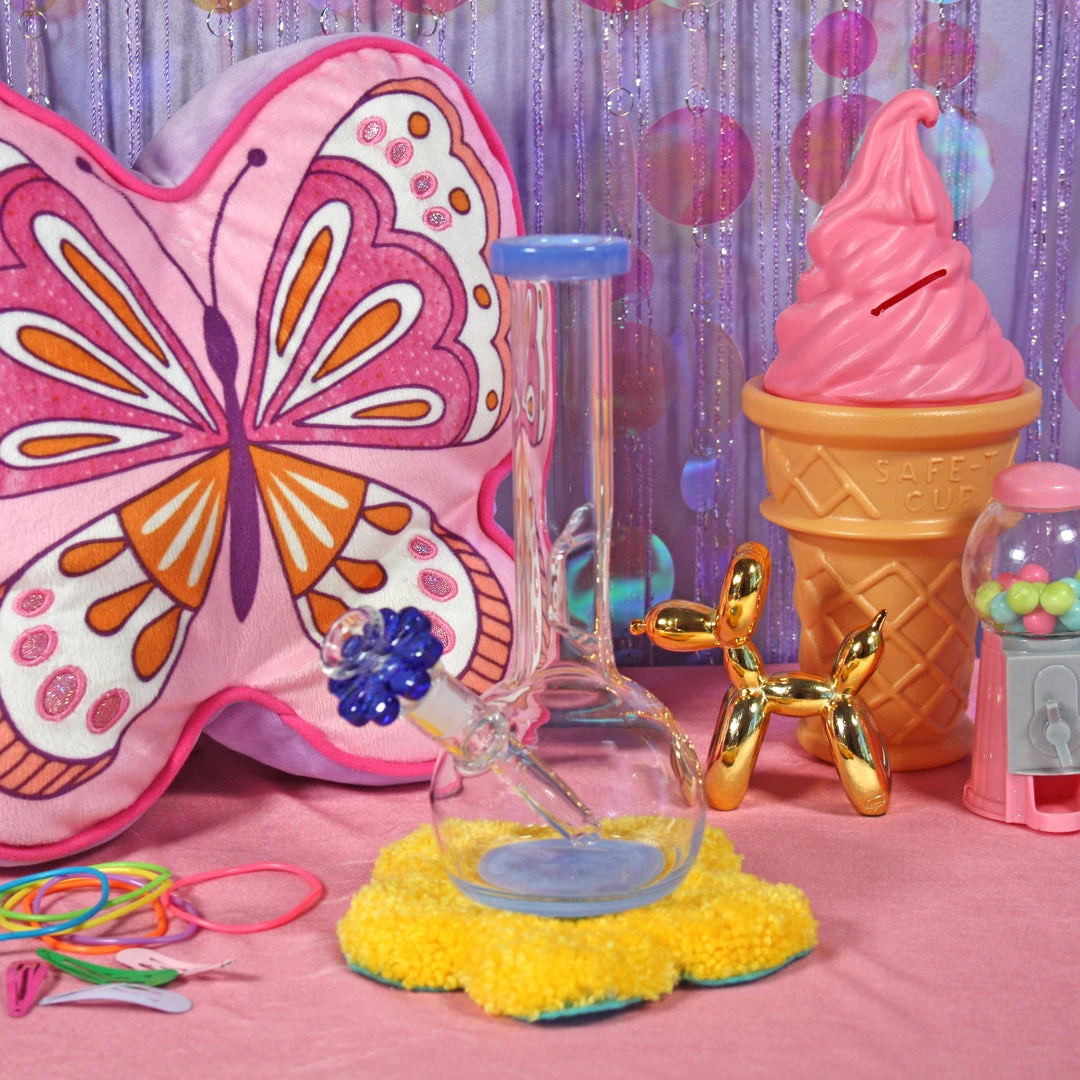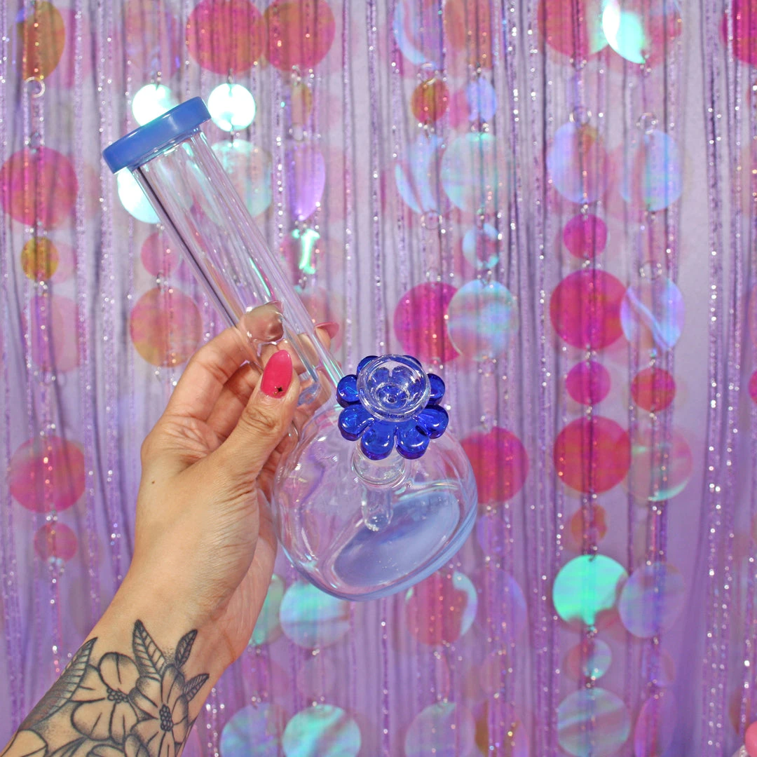 This piece is 8.5″ tall. A beaker shape makes it extra stable on any surface. Neck is long and even includes an ice catcher that doubles as a grip! Touches of jade blue glass are on the top and bottom of this piece. We love the blue on the bottom! Even comes with a matching blue daisy slide <3
