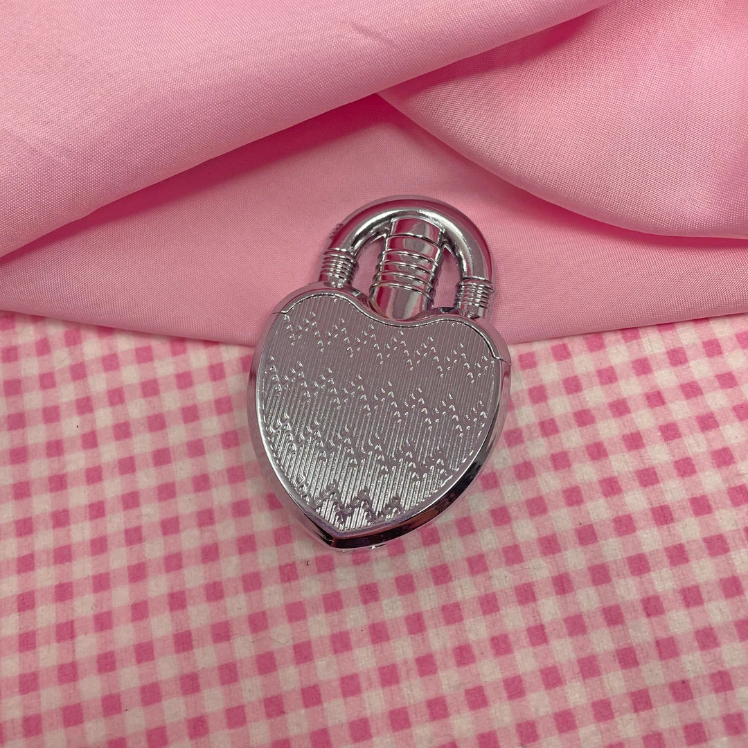 Lighter is silver and shaped like a heart shaped lock. To use the lighter, first FILL IT with butane fuel using the hole in the bottom. To light, lift the top “lock” part and press the button that was underneath the light.