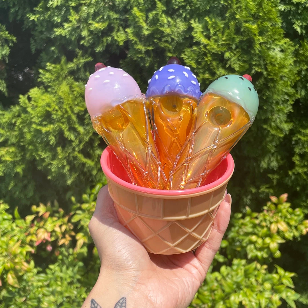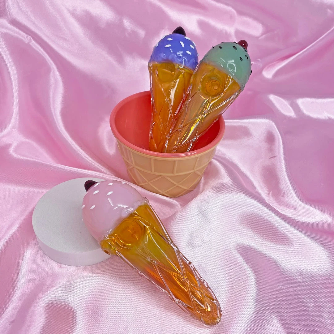 This pipe features a bowl on the top of the scoop of ice cream and a mouthpiece at the end of the cone. One carb is located on the left side of the cone.
