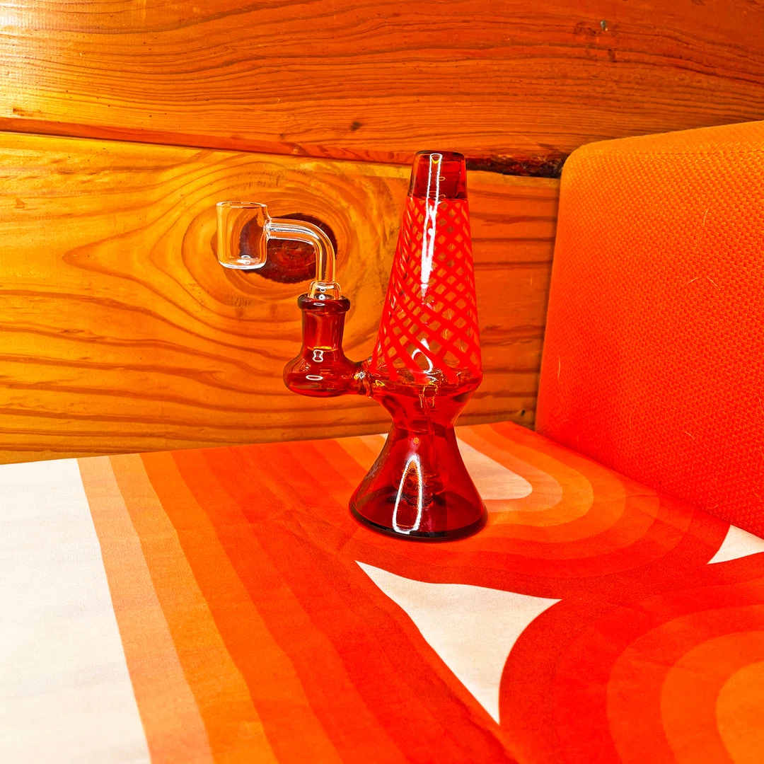This mini rig measures 6″ tall and comes with a 14mm quartz banger. Each piece is made of high quality boro glass. The base of this lamp is extremely sturdy- it’s solid glass which will keep your piece steady while you use it. The “lava” area is made of swirled glass in a contrasting color.