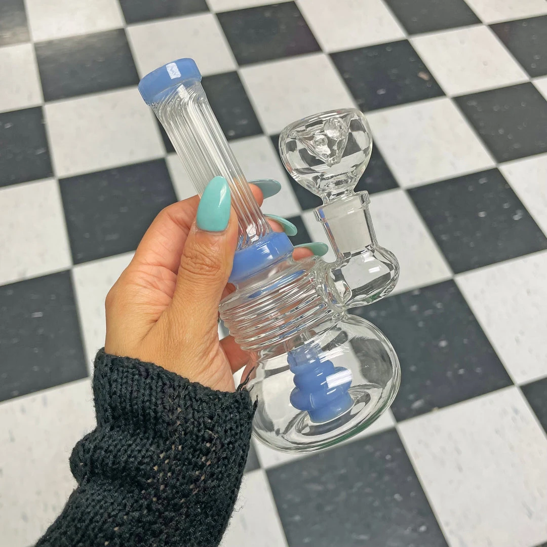 This bong features clear glass with colored accents. This piece is very stable because of the cone-shaped base. The neck of this guy is fluted which adds a classy touch if you ask me!