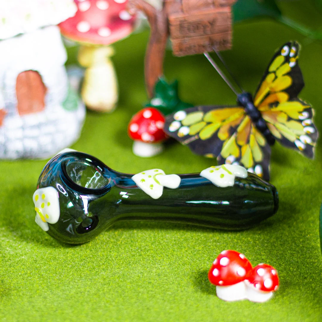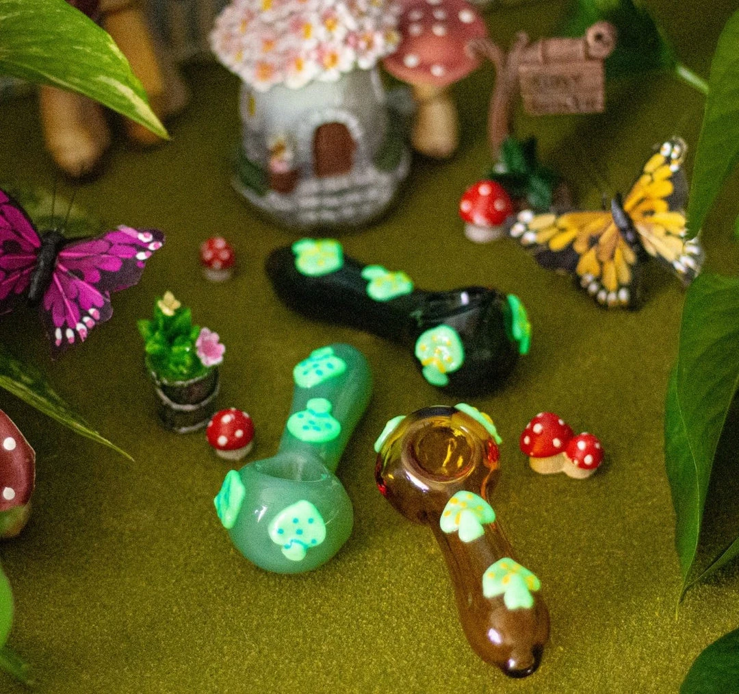 These pipes feature mushrooms scattered around the entire length of the pipe and bowl. The best part? The mushies glow in the dark! Each pipe also has a flat side under the bowl to keep it from rolling 🙂
