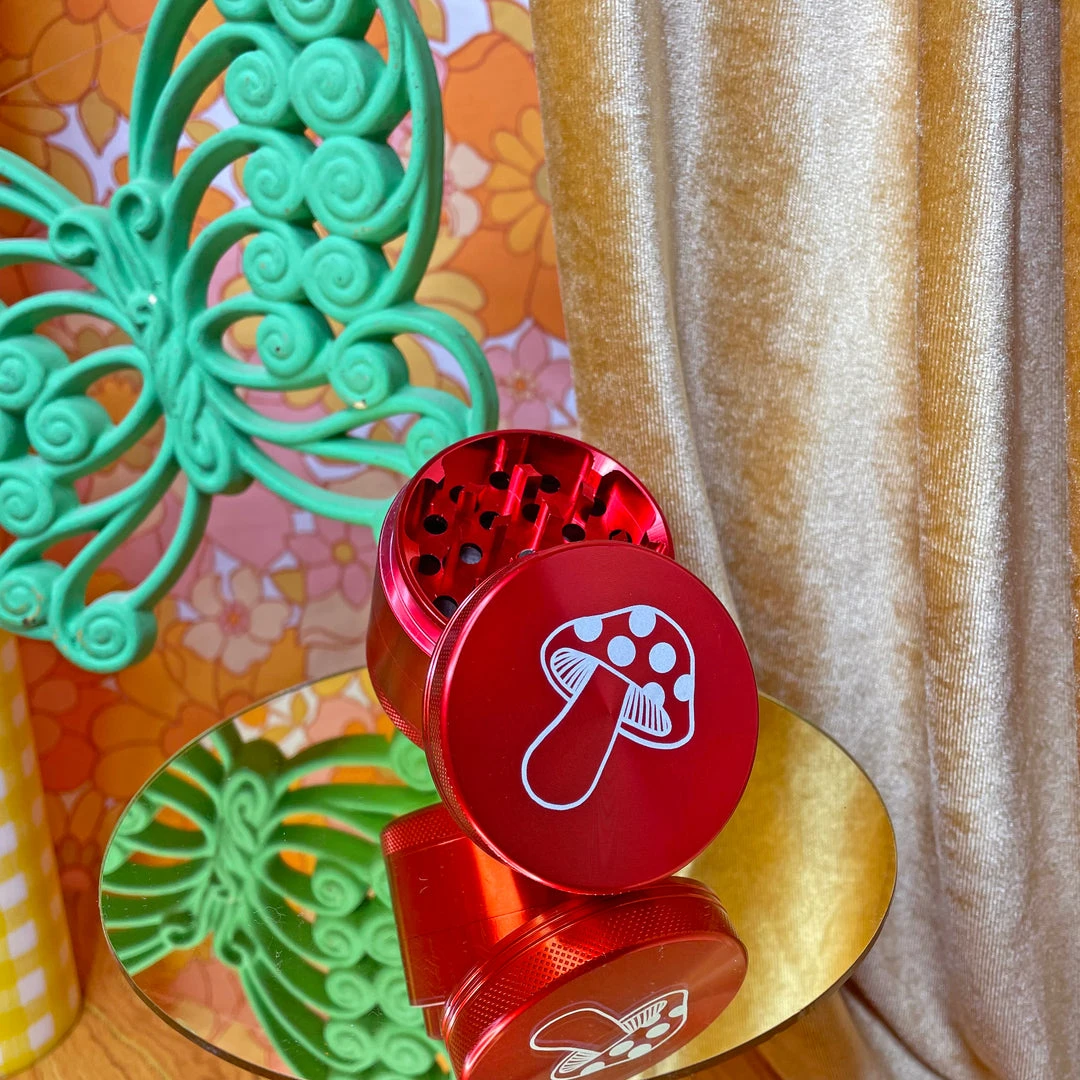 Metallic red grinder is engraved with a mushroom on the top lid and features 4 parts with 3 compartments. The top has a magnetic closure so you can infinitely grind it and the top stays on. The bottom compartment collects the kief and even comes with an adorable little spatula to keep it clean.