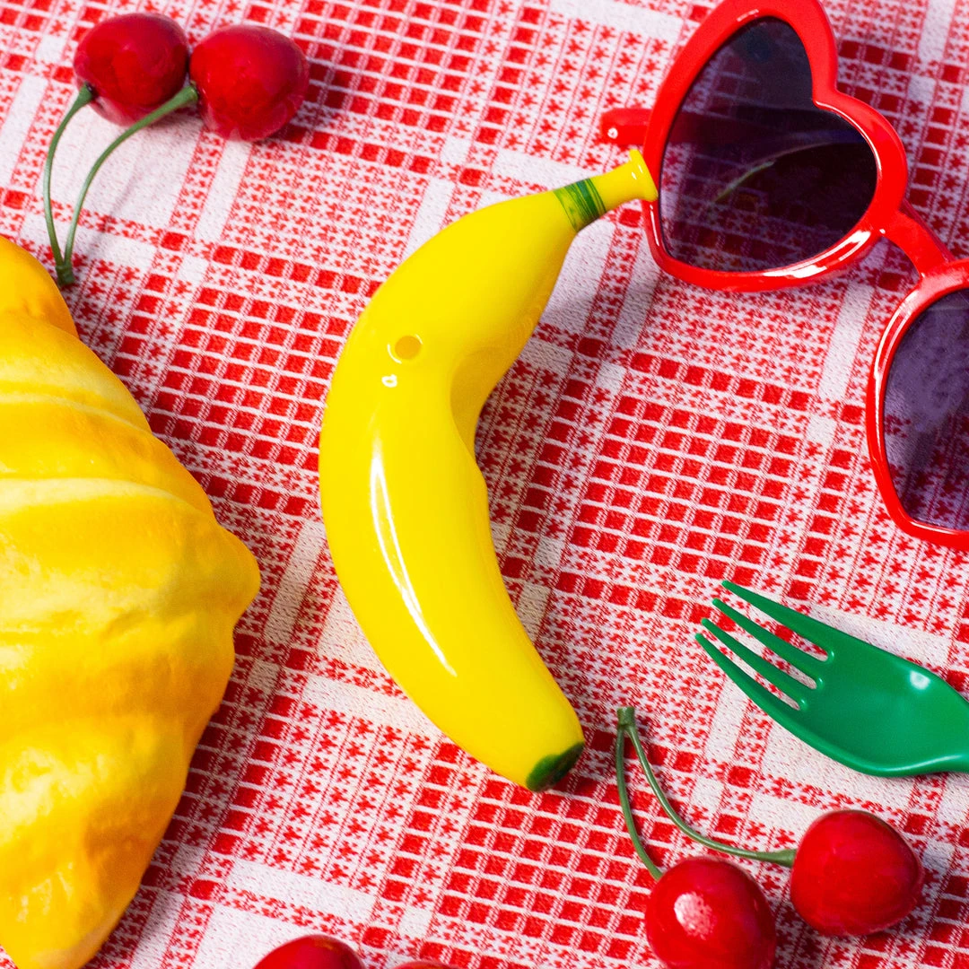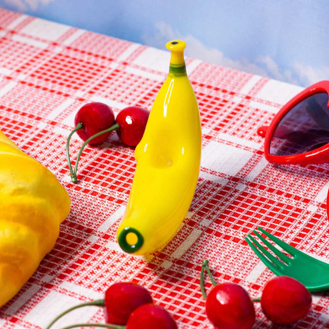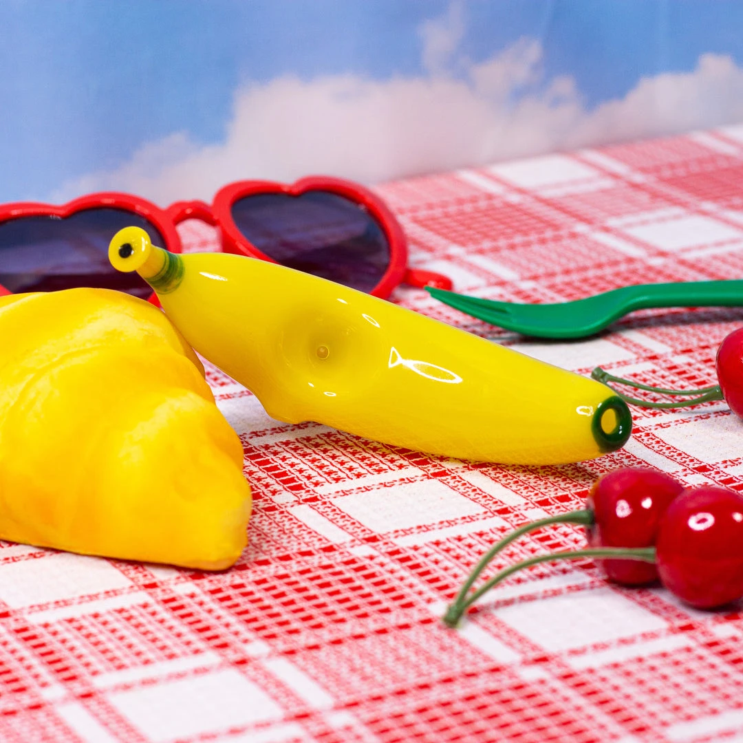 Pipe features a bowl on the end of the banana and a mouthpiece at the end of the banana. One carb is located on the left side of the banana.Â