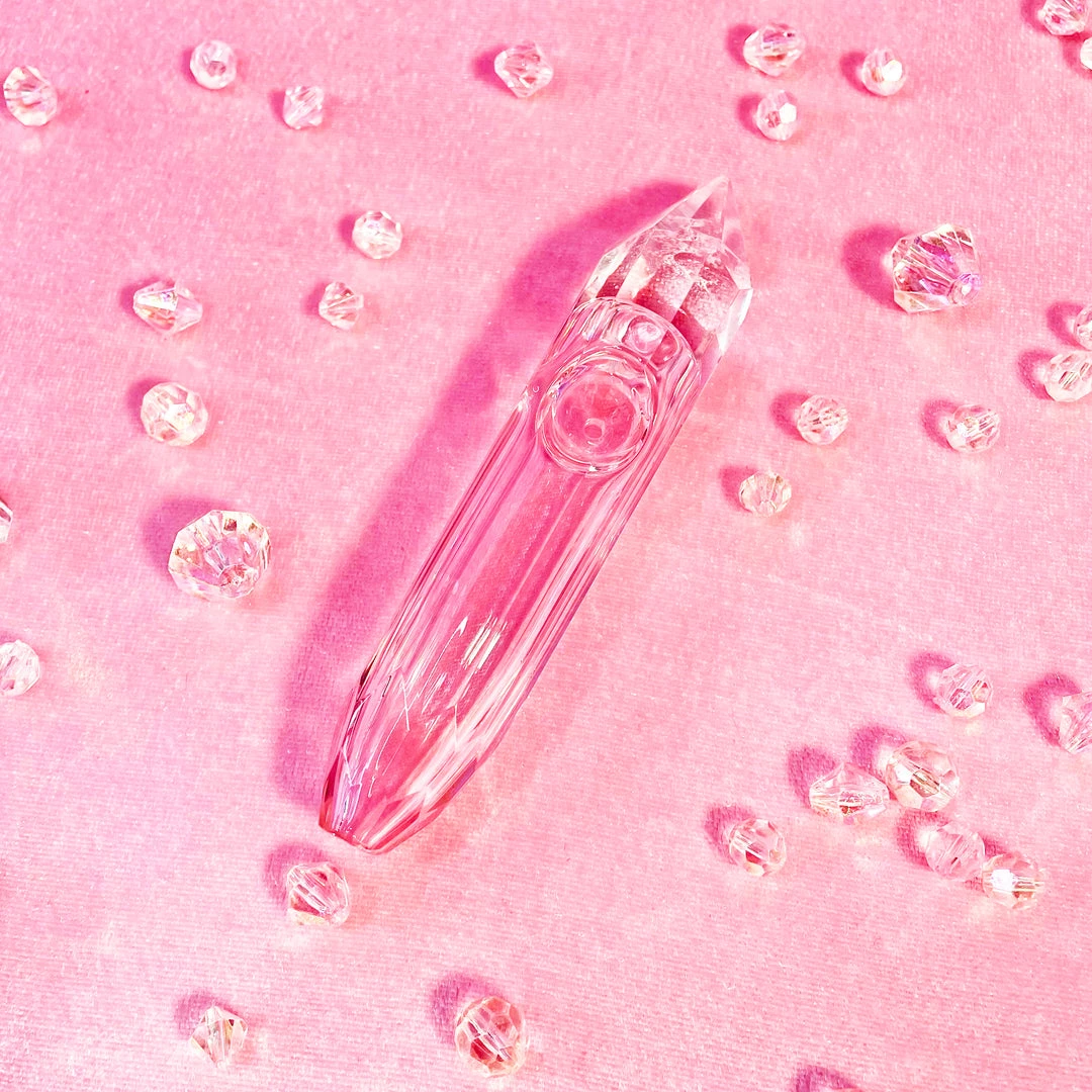 This fully functional pipe is made of pink boro glass and measures 5″. Faceted just like a crystal!