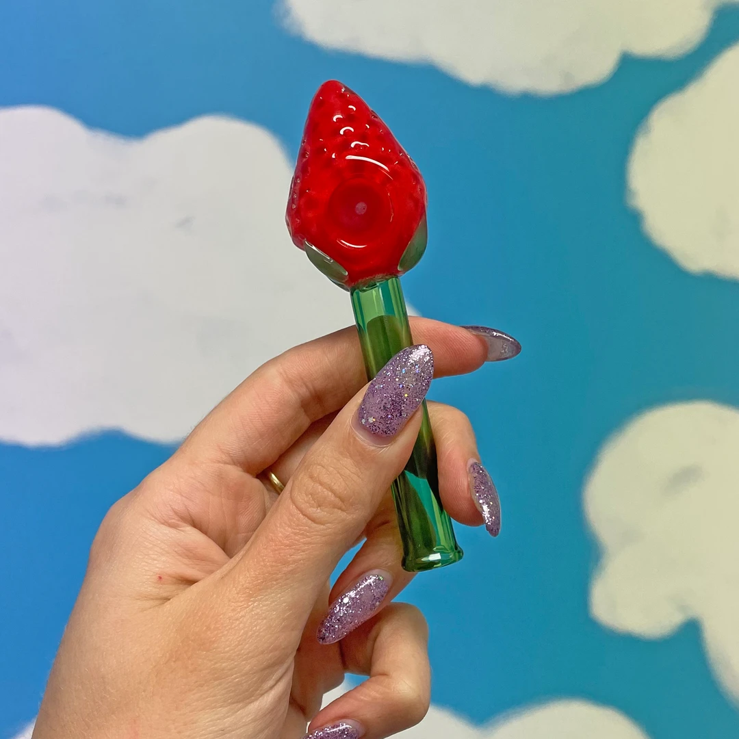 Pipe features a bowl in the middle of the berry and a long stem of blown glass with a mouthpiece at the end. One carb is located on the left side of the berry.
