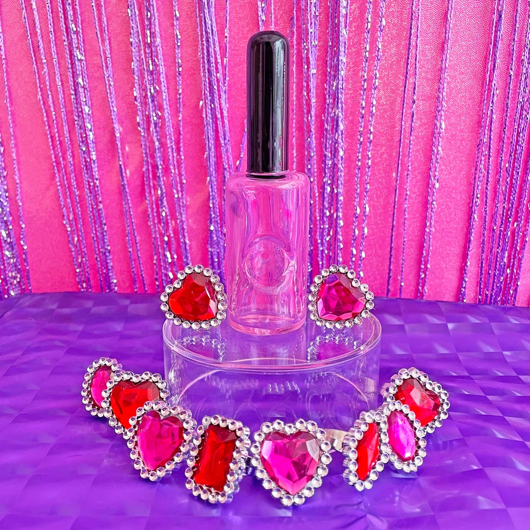 Made of sturdy pink borosilicate glass, this little number features a carb at the bottom, a bowl on the top of the bottle and the black mouthpiece is the top of the application handle. Cute, right?