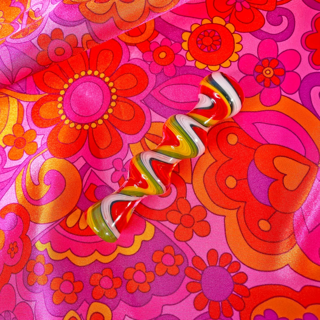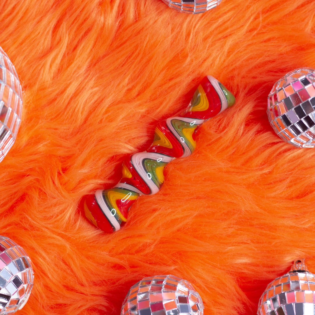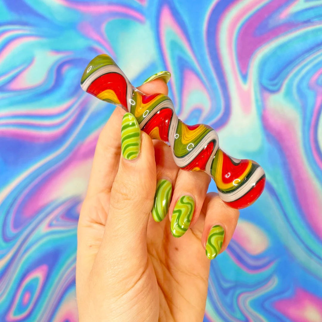 This is a chillum-style piece. Made of sturdy boro glass, this chillum has a sexy bulbous shape. Wags in rainbow colors run throughout. Trippy!