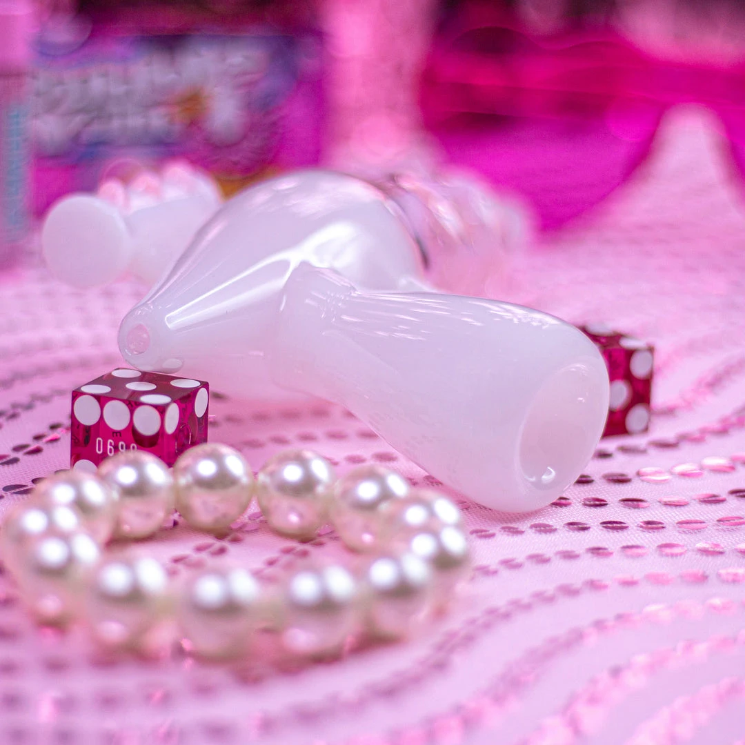 This fully functional pipe is made of pink and white borosilicate glass and measures 7.5″ x 5.5″ x 2″.