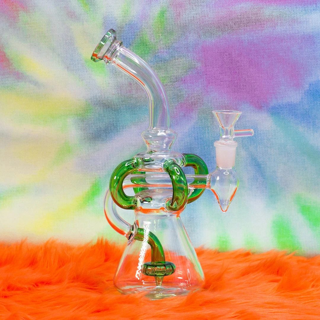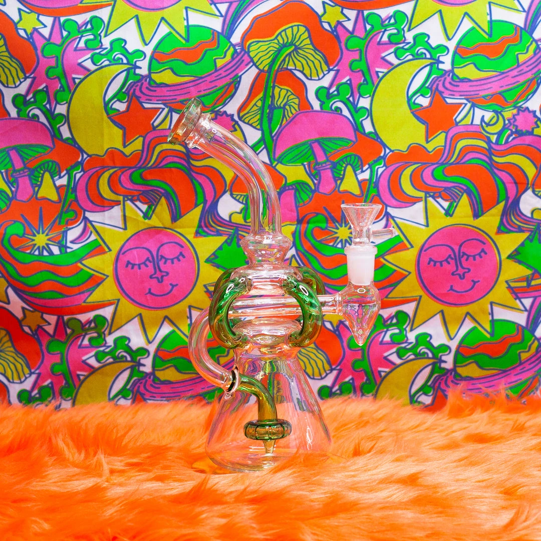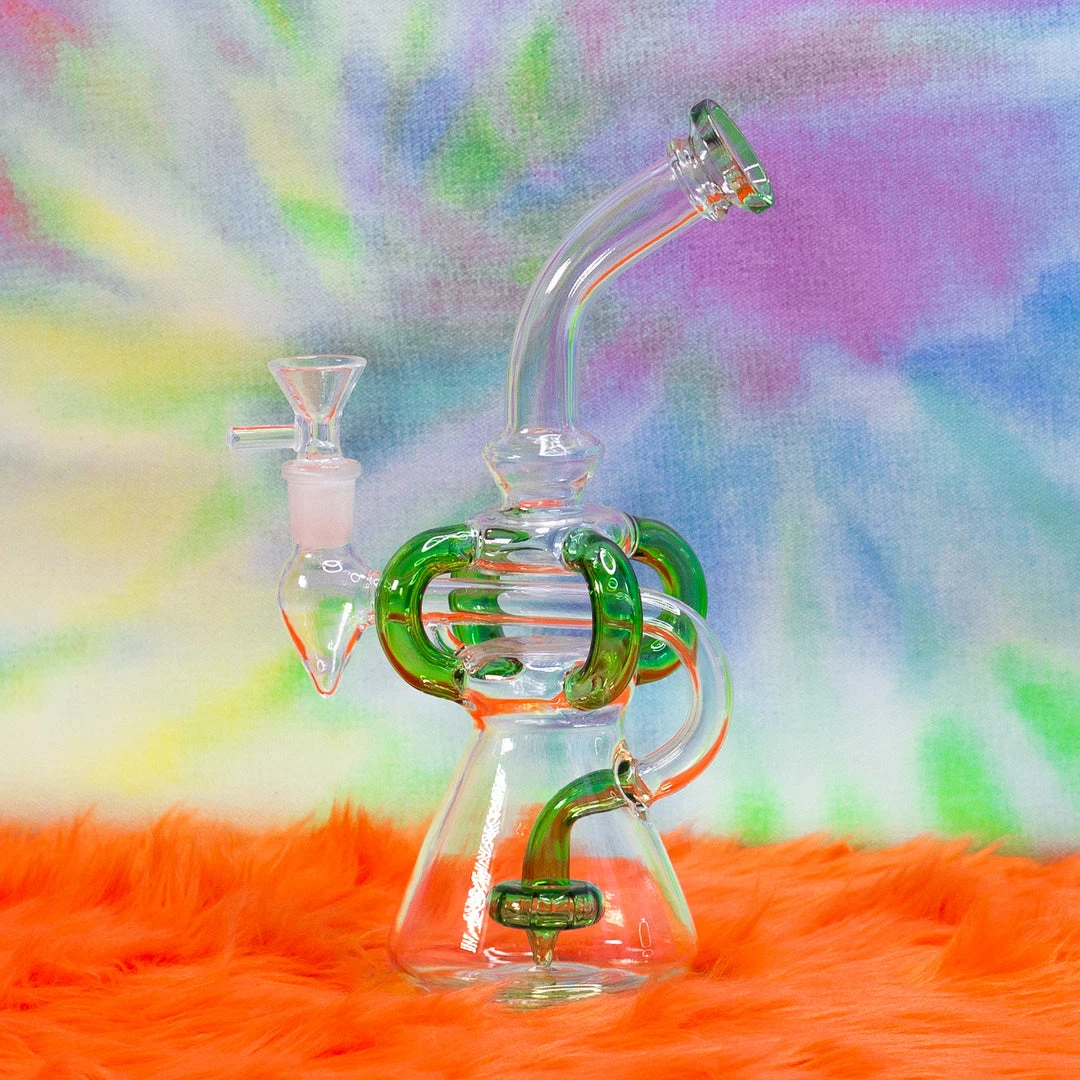 This piece features a split perc, four recycling tubes, an ash catcher and splashes of green glass.