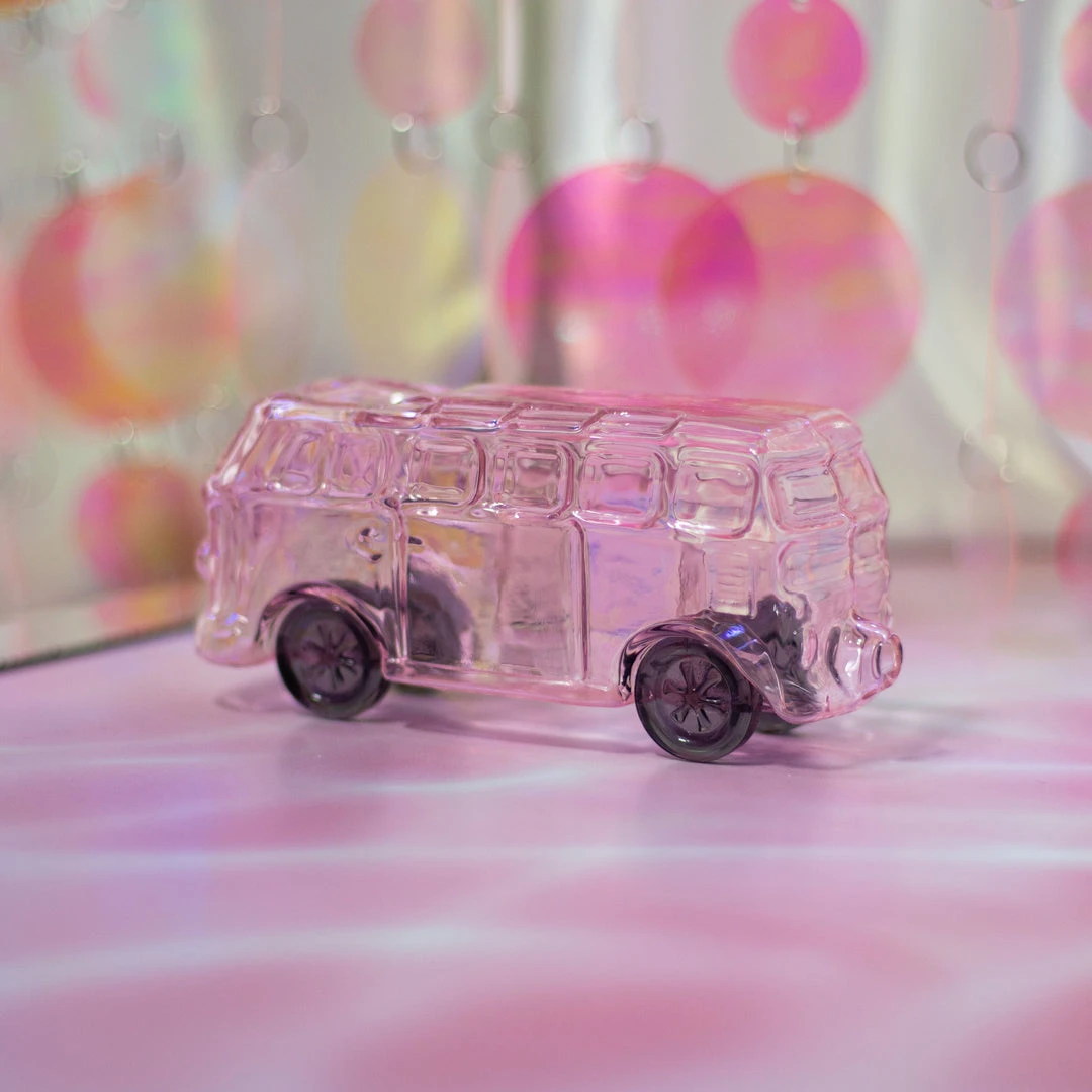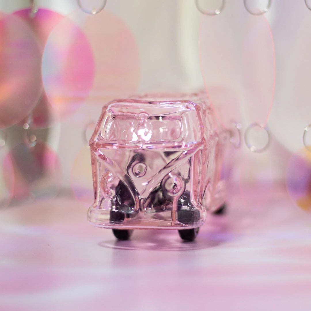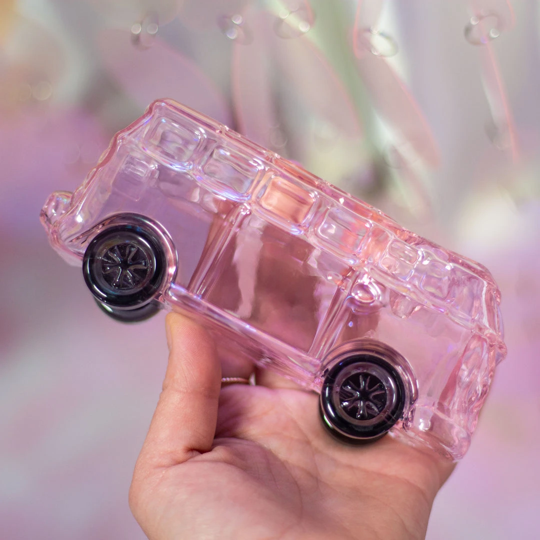 This fully functional pipe is made of pink boro glass and measures 5″ x 2.25″ x 1.75″. Shaped like a retro van complete cute wheels! Even has cute details like windows and headlights.