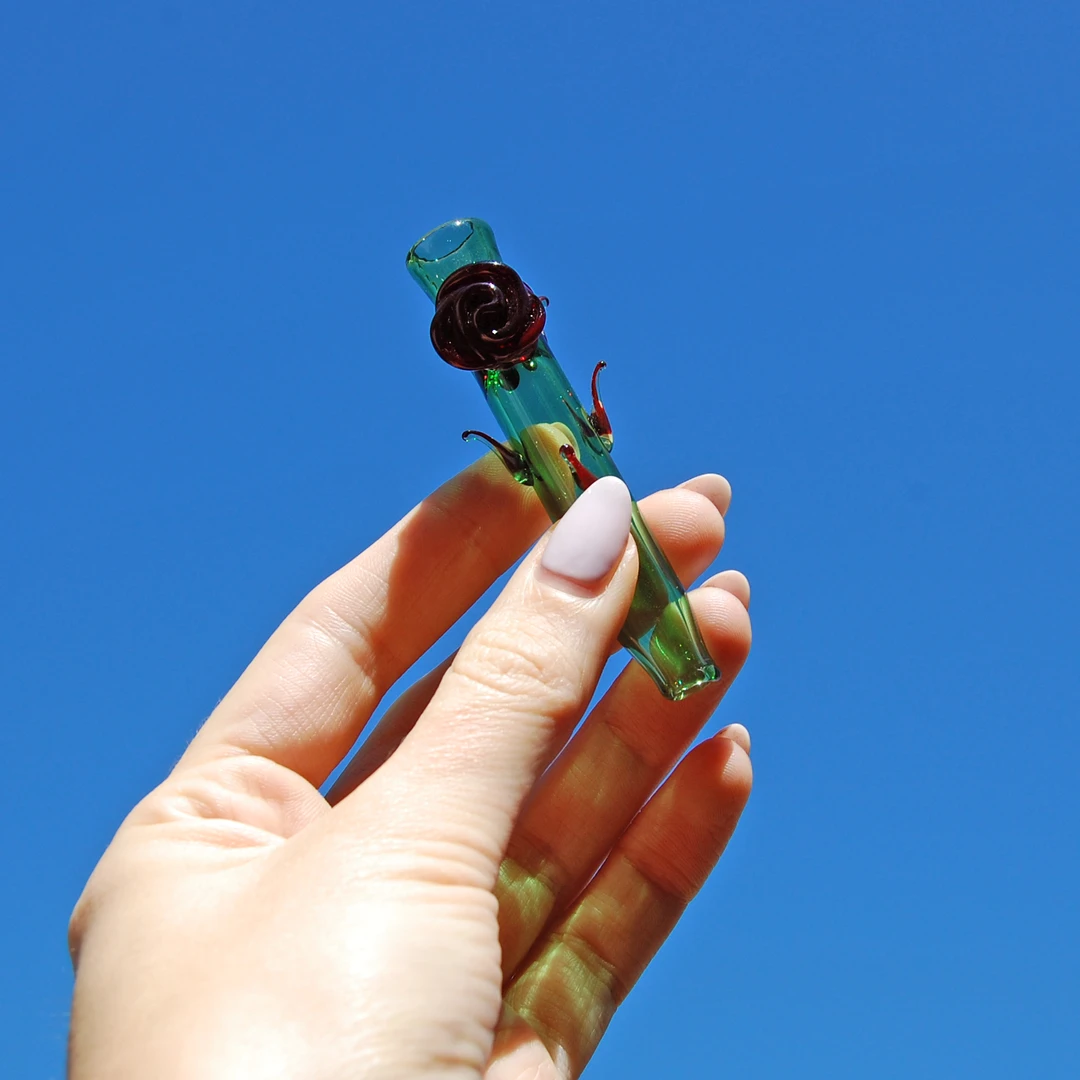 They are a chillum style pipe that perfectly resemble a rose. An hourglass green tube perfectly holds a hit while the thorns are engineered to keep this piece stable when placed on a surface. A deep red rose flanks the top of the tube. No carbs on this pipe! They are a chillum style pipe which means the bowl is perpendicular to the ground when you smoke it.