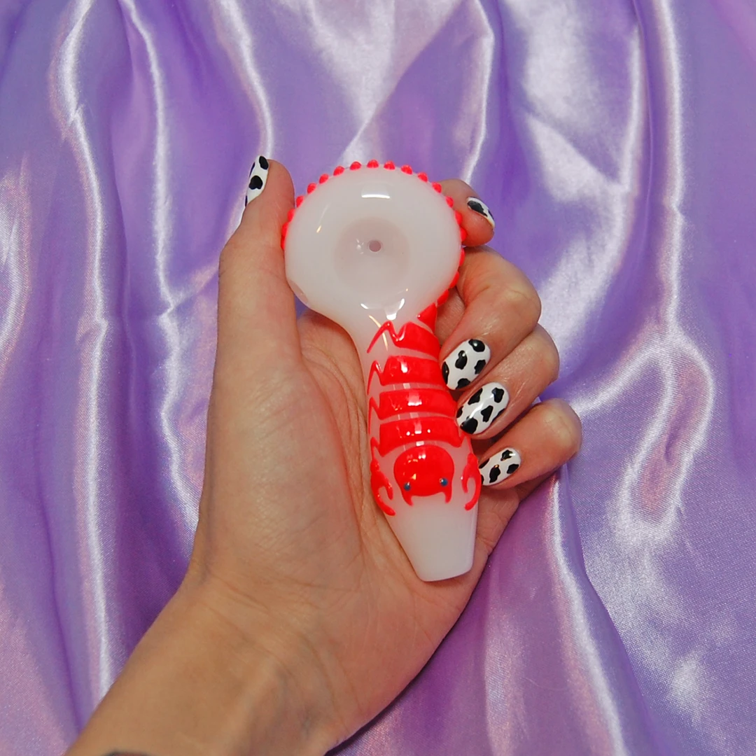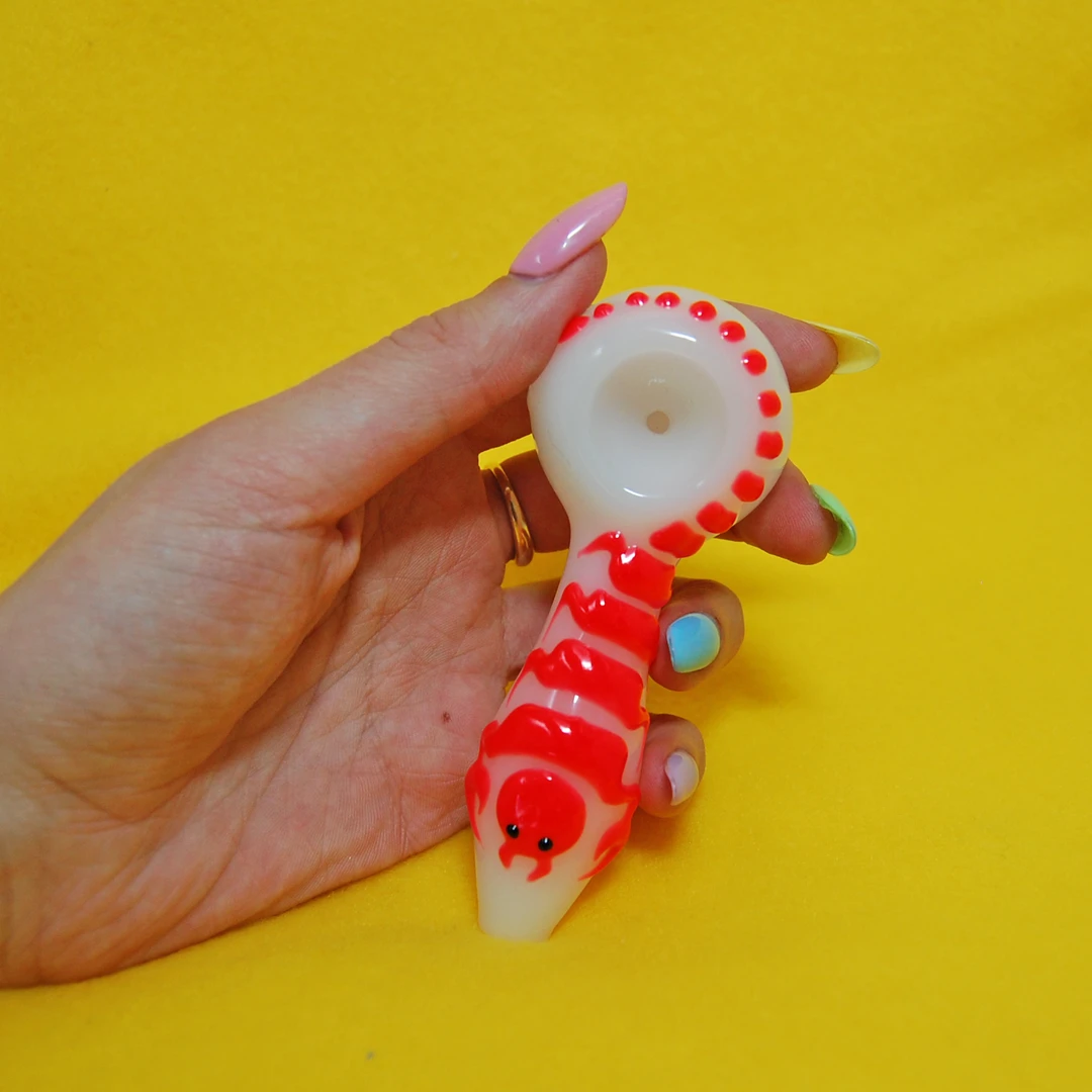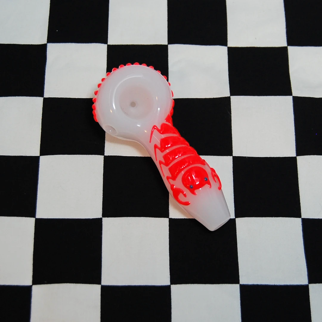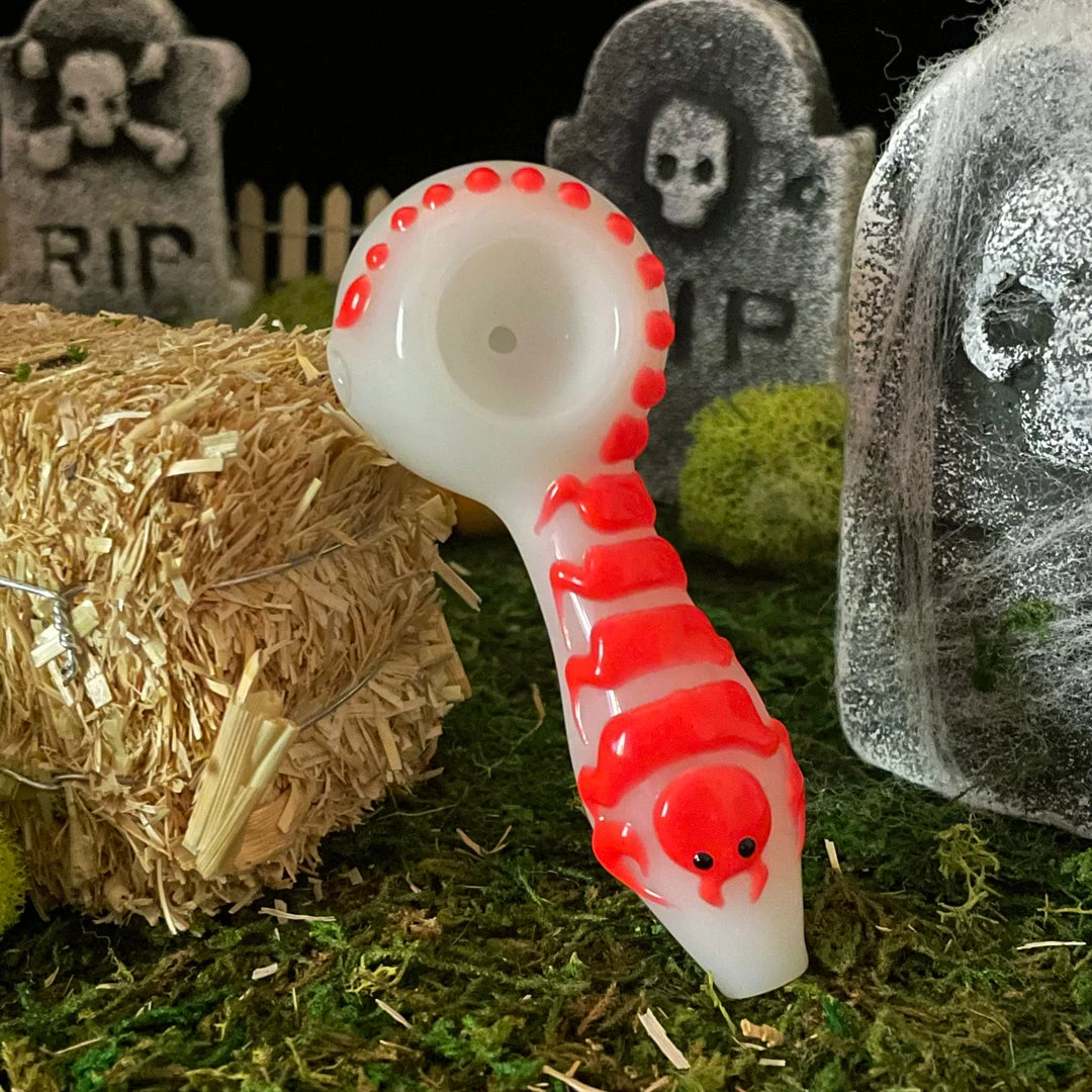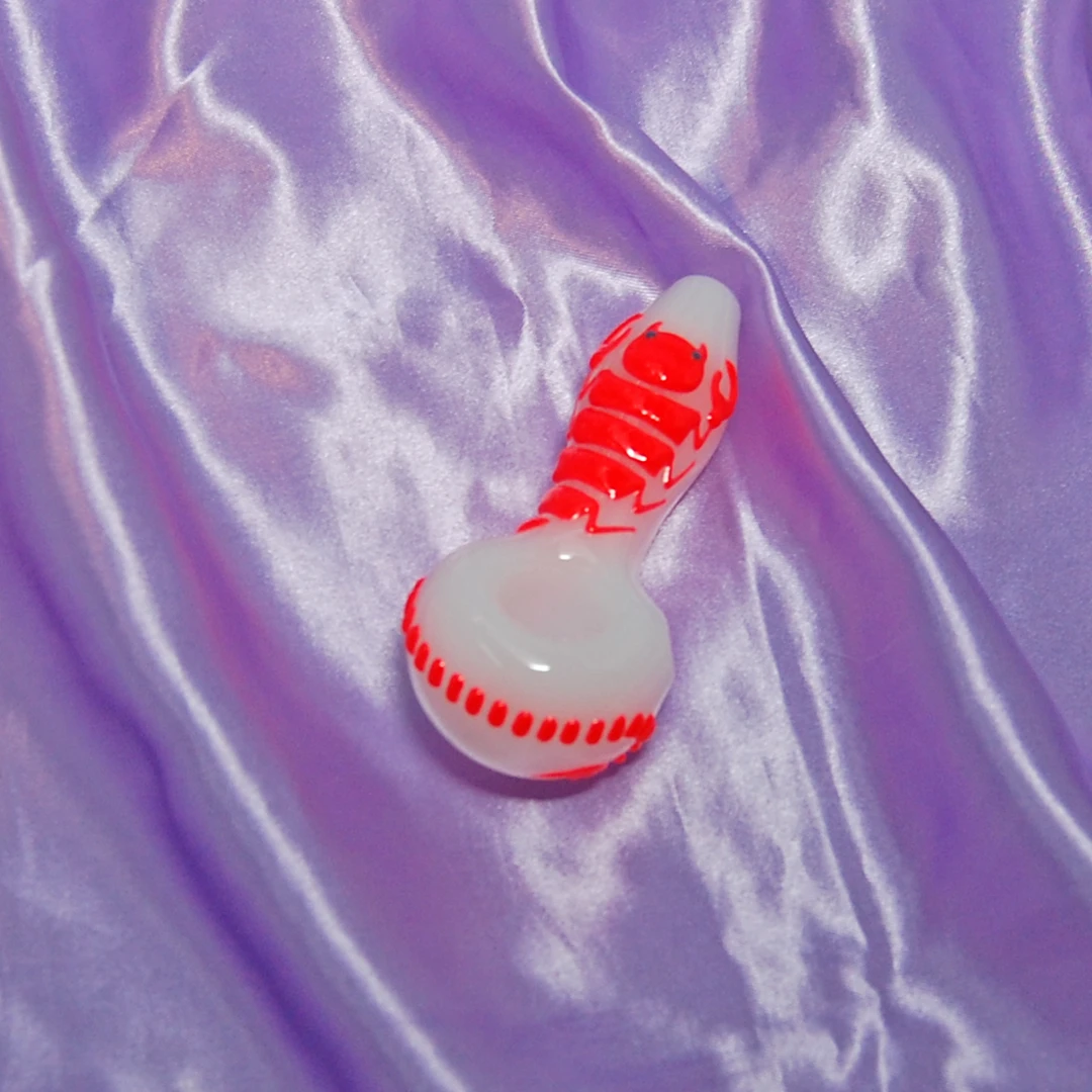 These pipes feature a scorpion swirling around the entire length of the pipe and bowl. The best part? These pipes glow in the dark! Each pipe also has a flat side under the bowl to keep it from rolling 🙂