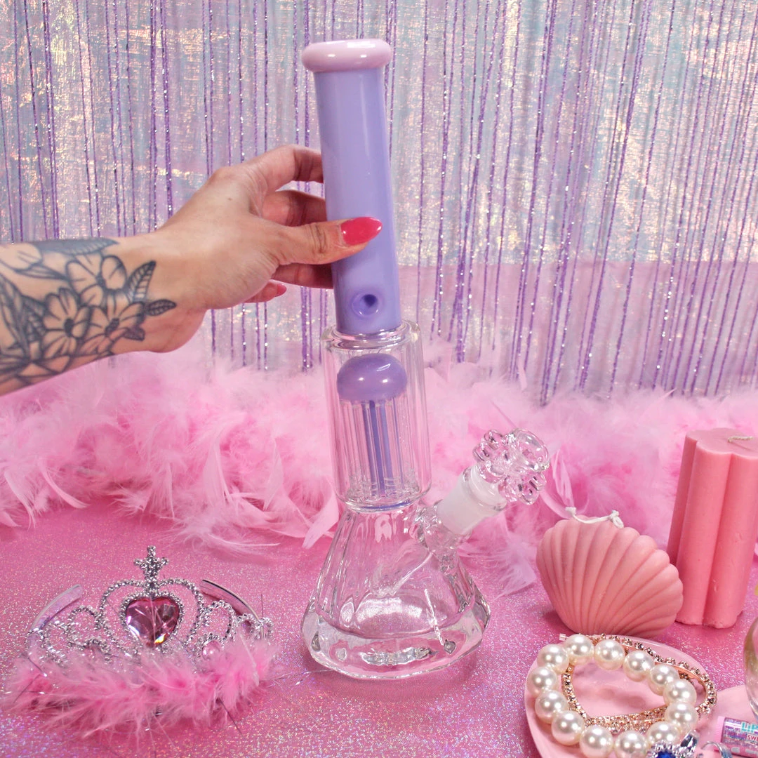 This bong features clear glass with pink and purple accents. Beaker shape but with a special HEAVY gem cut base. This glass is super high quality, hefty, durable! Complete with an ice catcher, she’s everything you want and need!