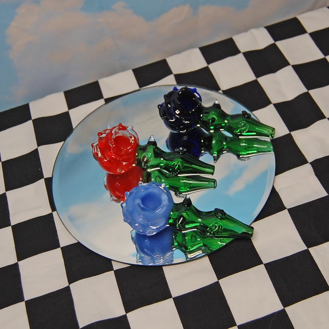Carb is located on the left side of the bowl. Made of borosilicate glass. Measures 4.25 inches tall x 2 inches wide x 1.5″ tall. Features petals flanking the bowl and a cute fluted stem with lil harmless thorns and leaves.