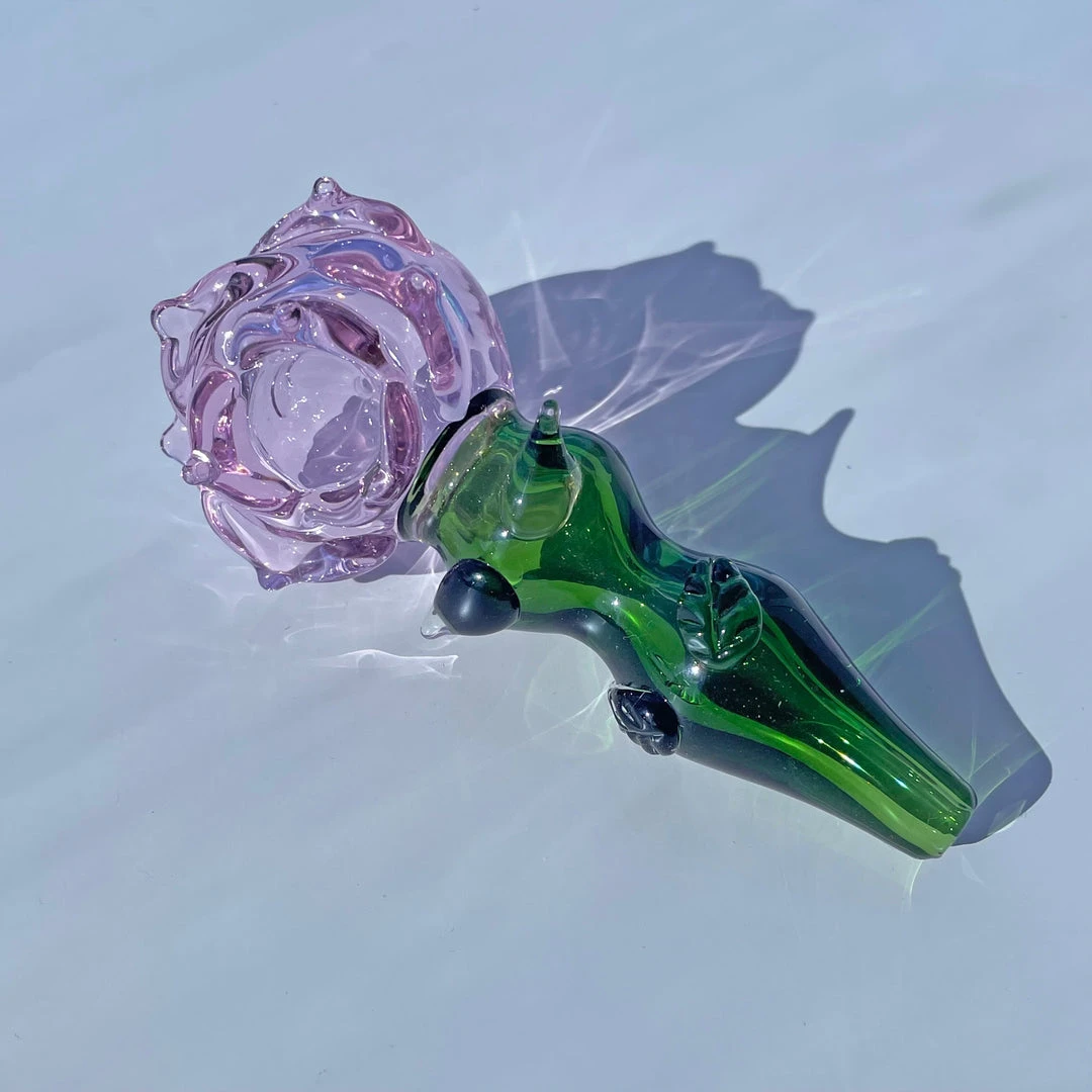Carb is located on the left side of the bowl. Made of borosilicate glass. Measures 4.25 inches tall x 2 inches wide x 1.5″ tall. Features petals flanking the bowl and a cute fluted stem with lil harmless thorns and leaves.