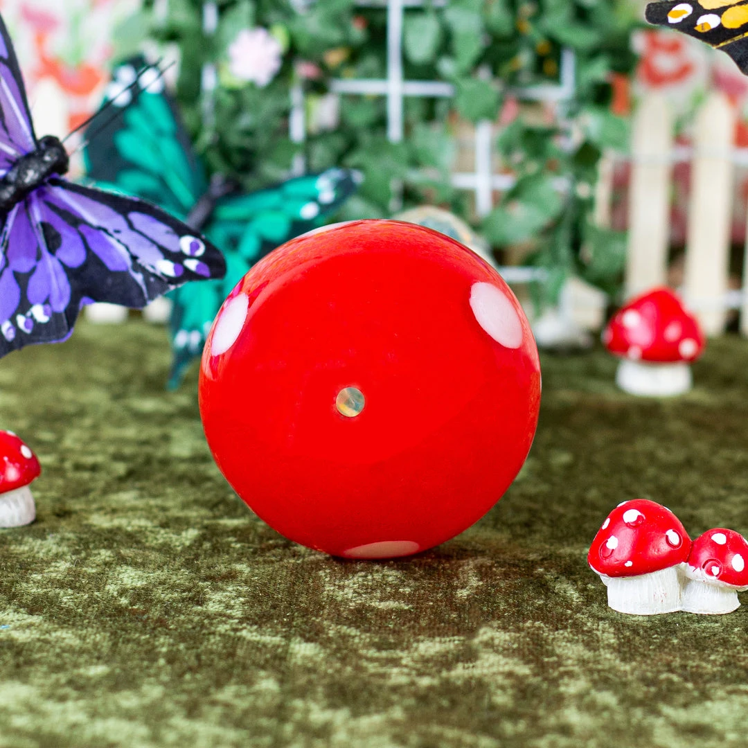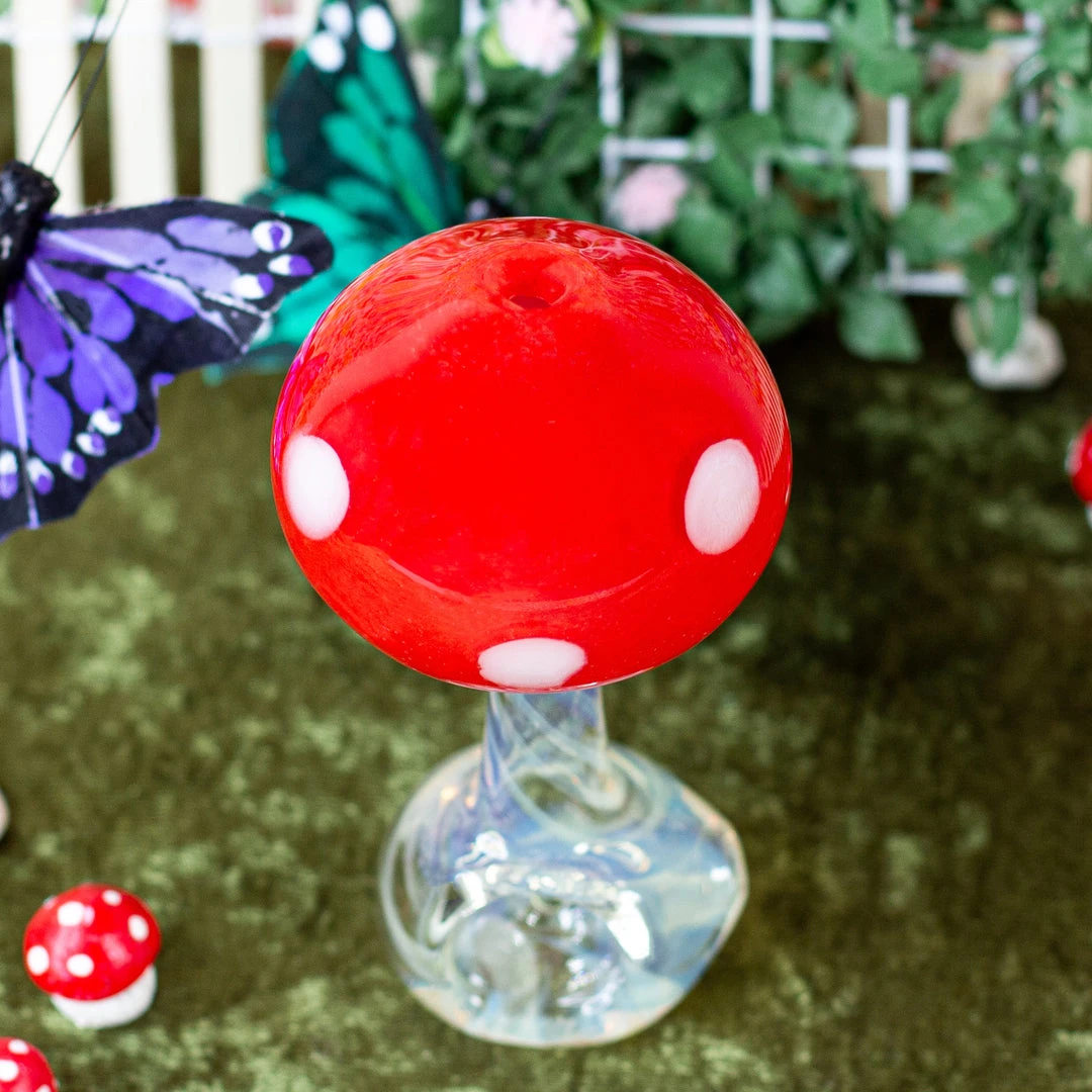 This pipe can stand on its mushroom stump or can lay horizontal on the ground. The detail on this piece is incredible- the top of the toadstool is perfectly plump and has cute lil white dots all around the top. The stem and bowl is made of clear glass with gorgeous gold fuming. The mouthpiece is at the top of the toadstool and the carb is on the side of the bowl.
