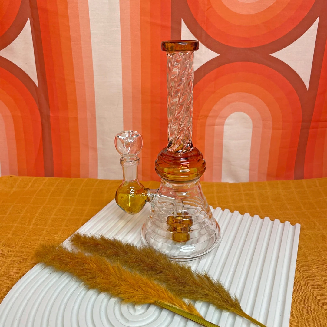 This bong features clear glass with amber accents. This piece is very stable because of the cone-shaped base. And she has an amber ash catcher. A gorgeous piece!