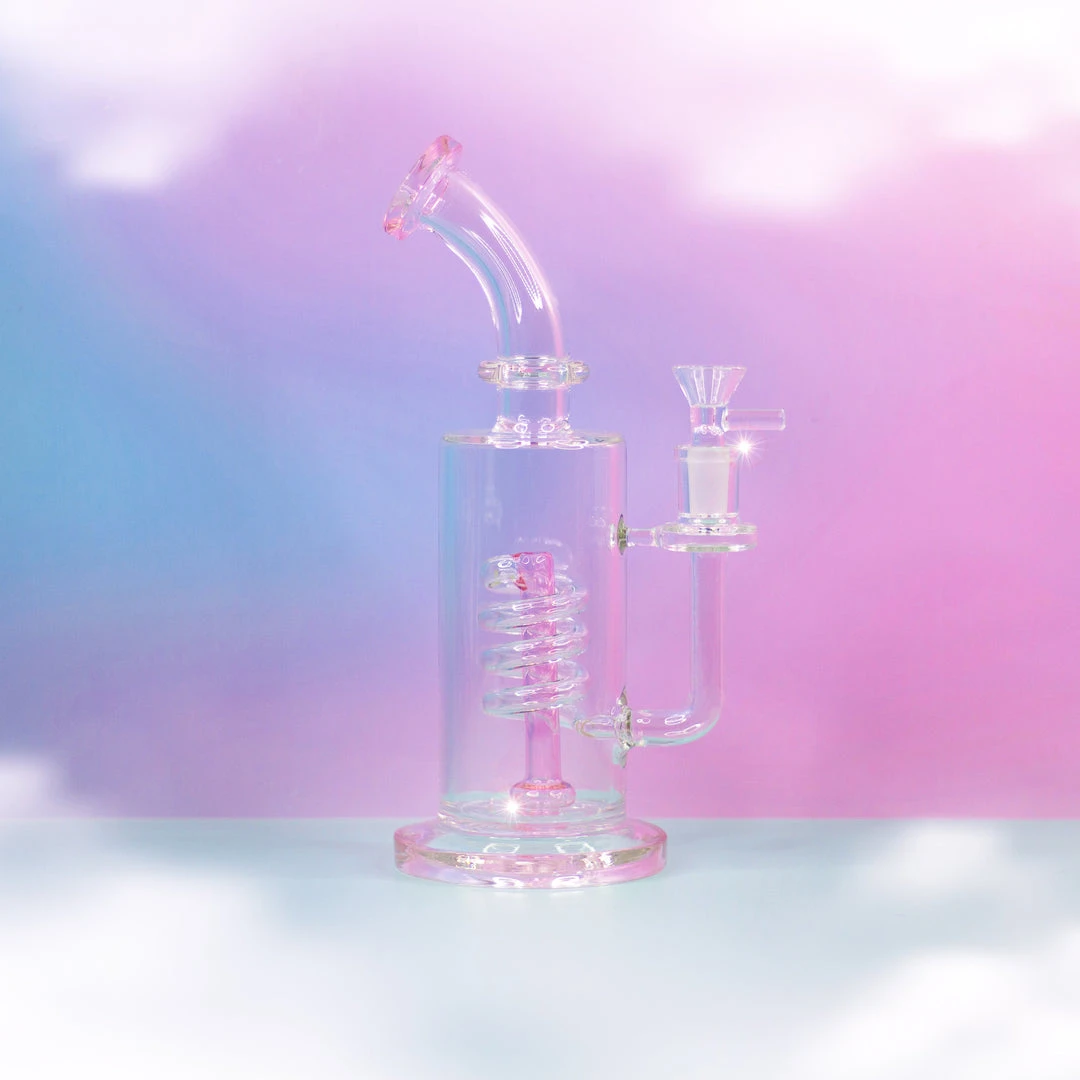 This bong features clear glass with colored accents. We love love LOVE the perc on this one! A looong tube coming from the slide swirls around the perc. This means your hits will be extra cool! The neck on this piece is bent and the long tube supporting the slide helps to filter ash. All on top of a super stable base 🙂