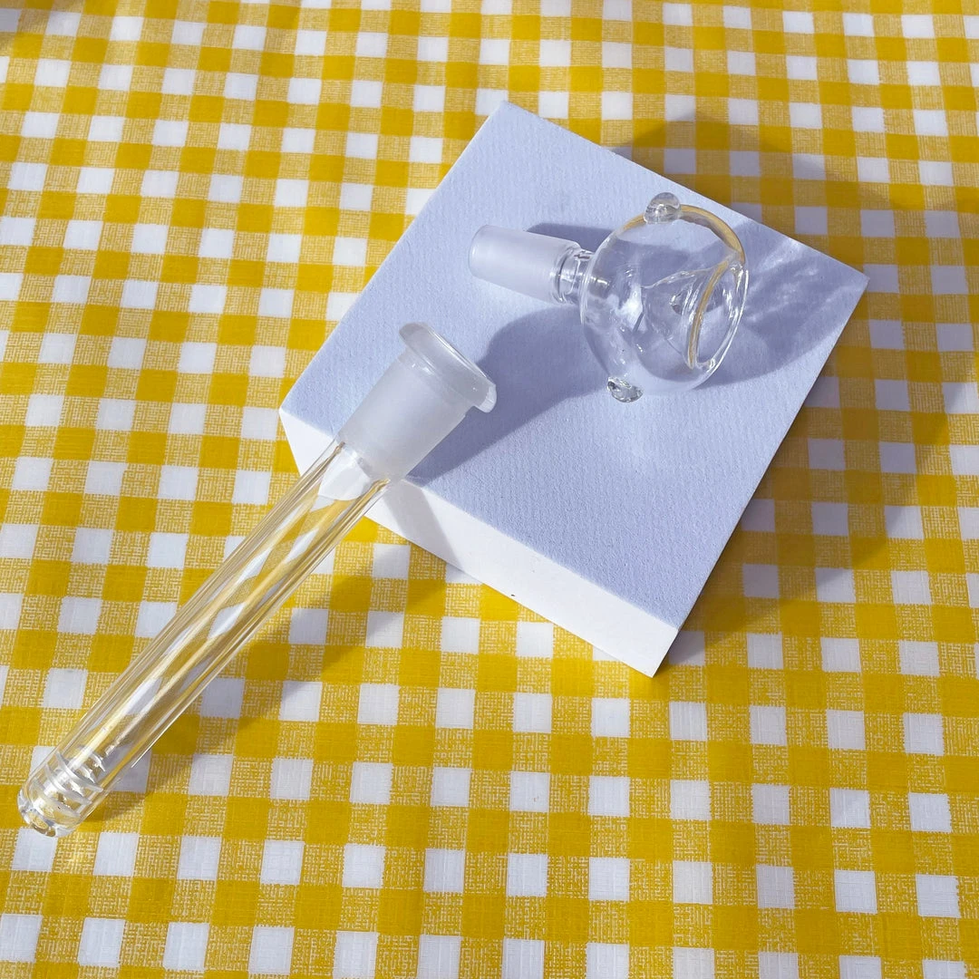 She comes with a 14mm bowl. It is compatible with any of the slides on our site, or you can add a banger to make this a rig!