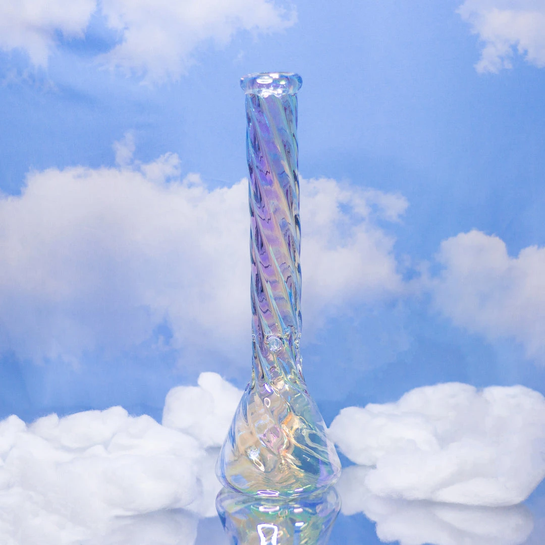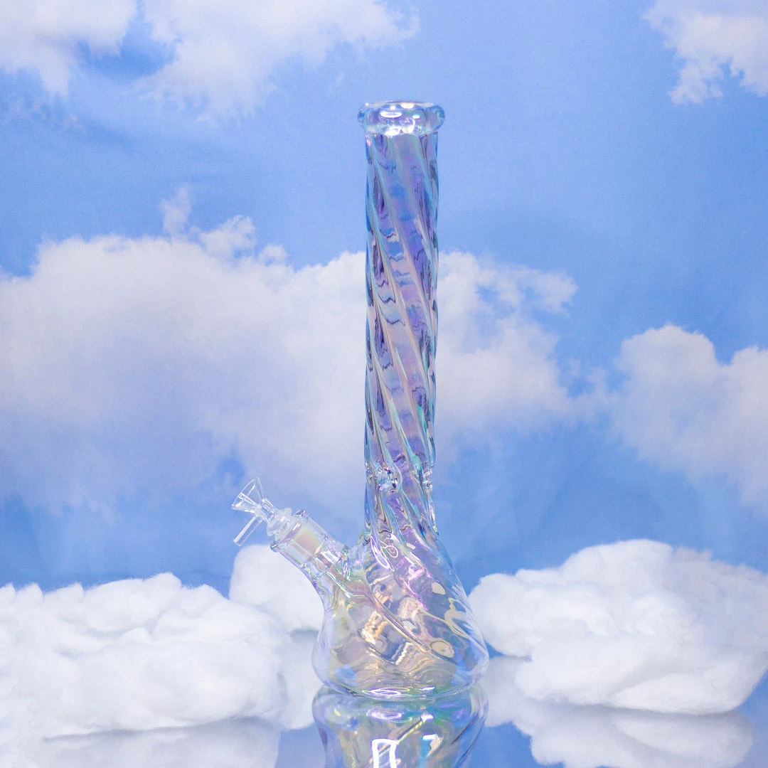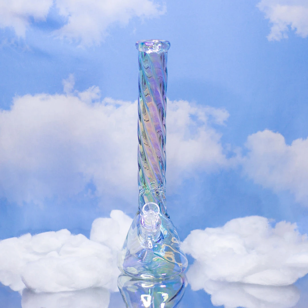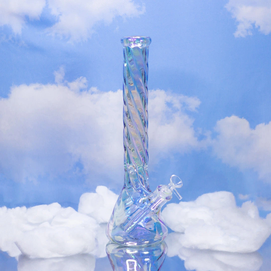 The Day Dreamer water pipe features an ice catcher and an iridescent sheen on twisted sturdy boro glass. A wide beaker base keeps her stable.