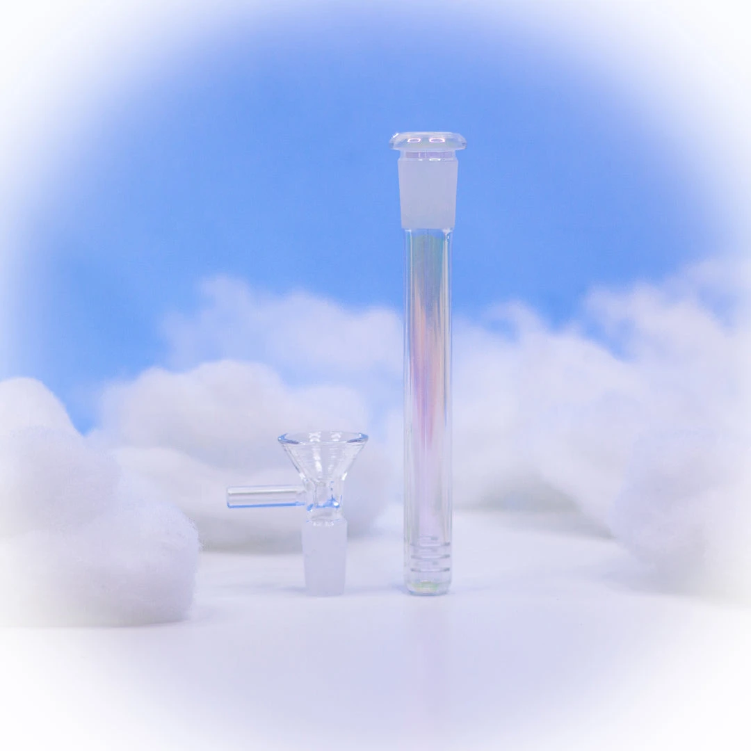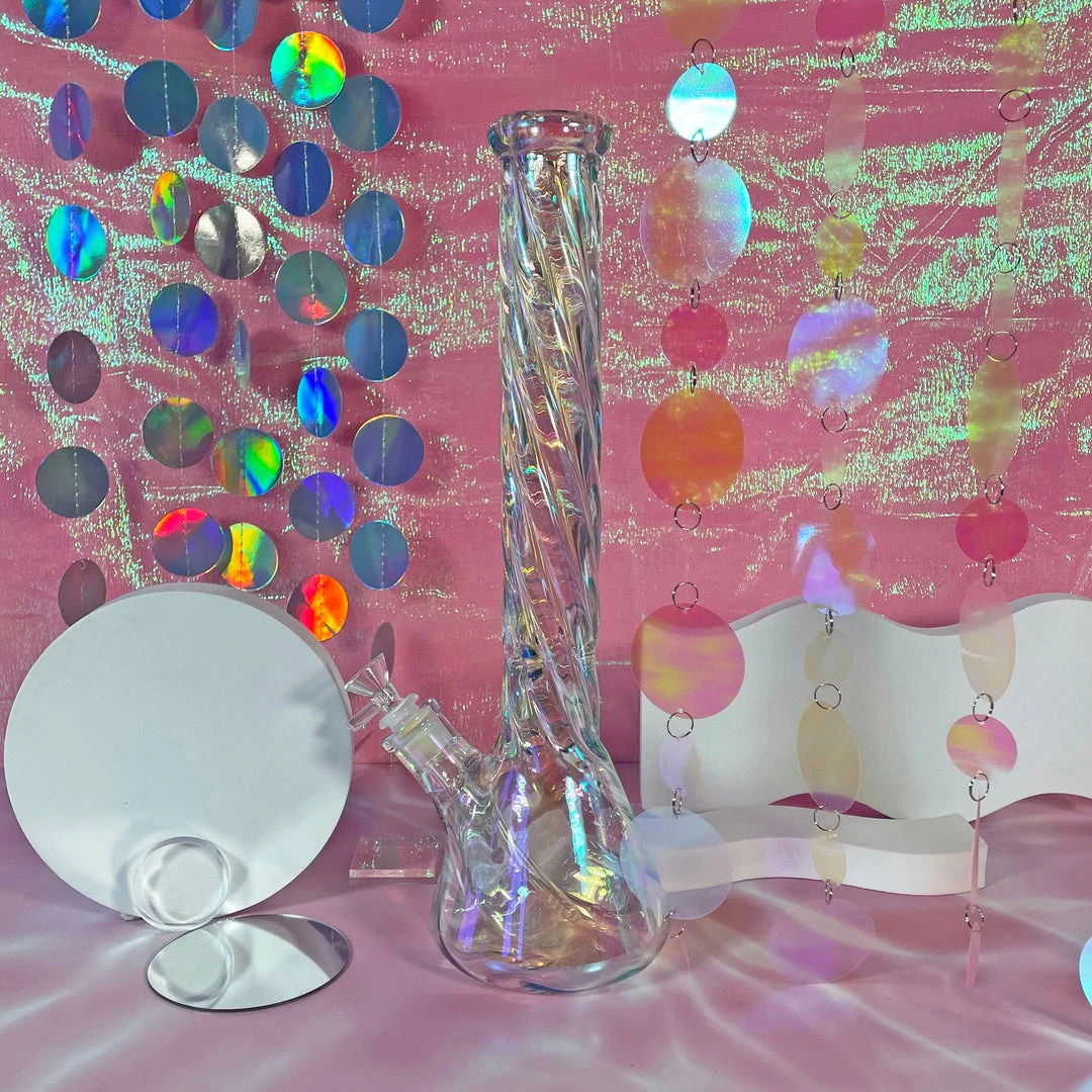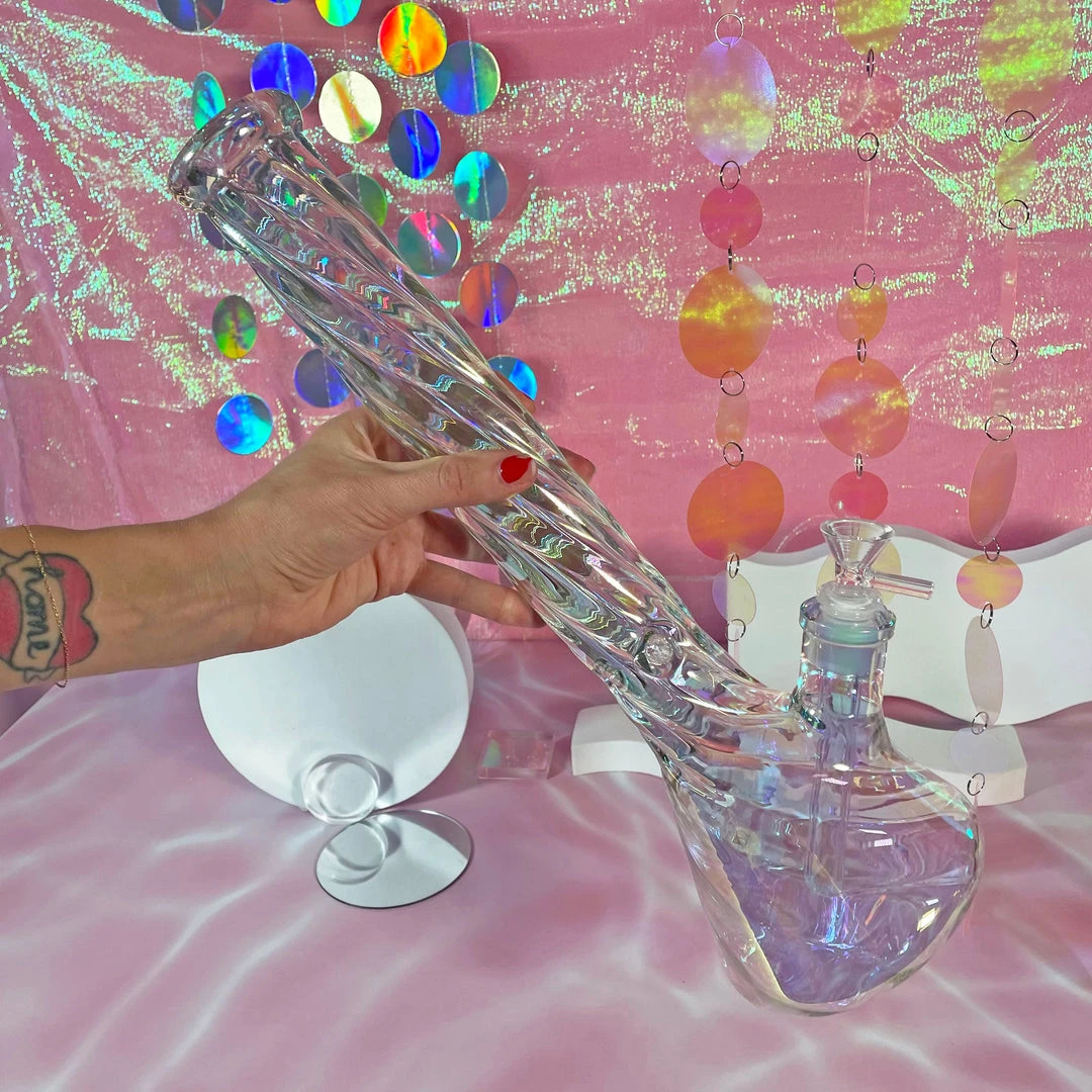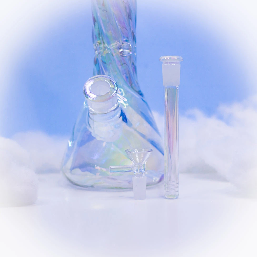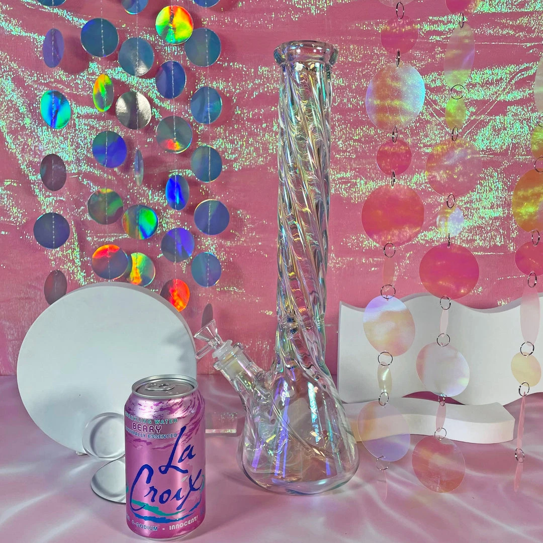 The Day Dreamer water pipe features an ice catcher and an iridescent sheen on twisted sturdy boro glass. A wide beaker base keeps her stable.