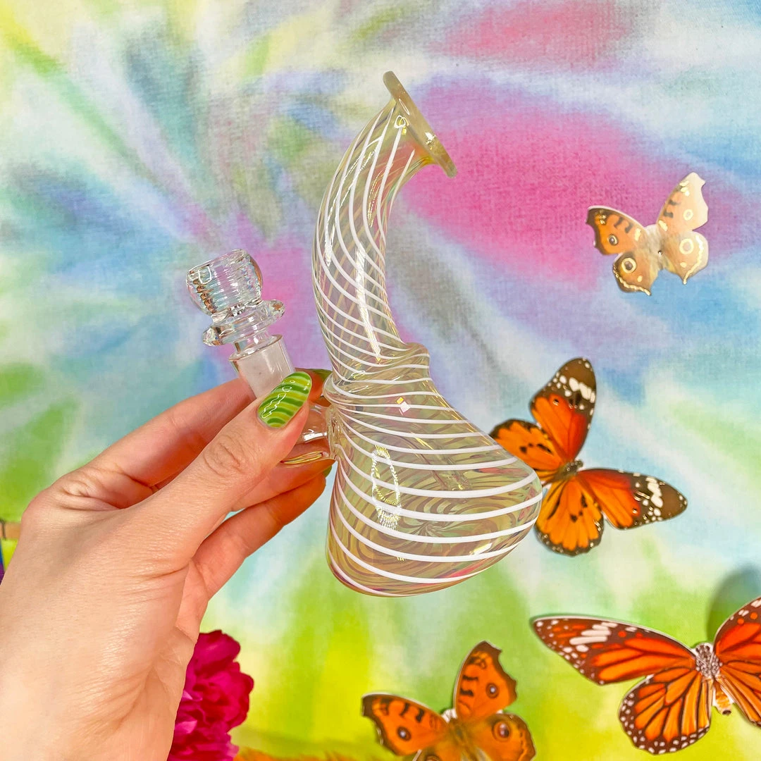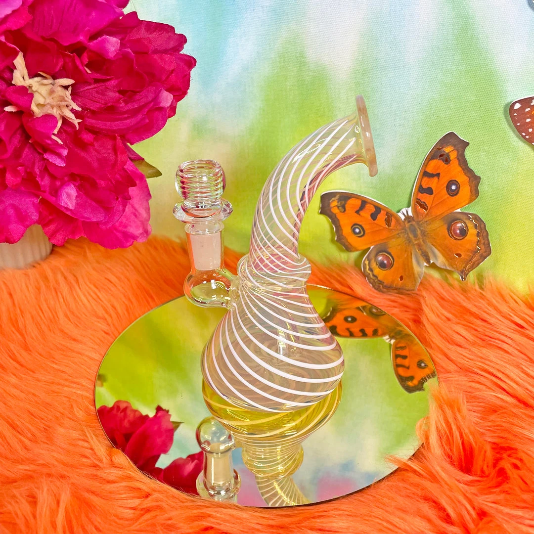 Made of warm yellow glass, this piece features a white swirl pattern throughout. The base of this bb is cone shaped for stability and the neck is curved for easy use. This piece also features an ash catcher and comes with a super unique 14mm quartz slide.