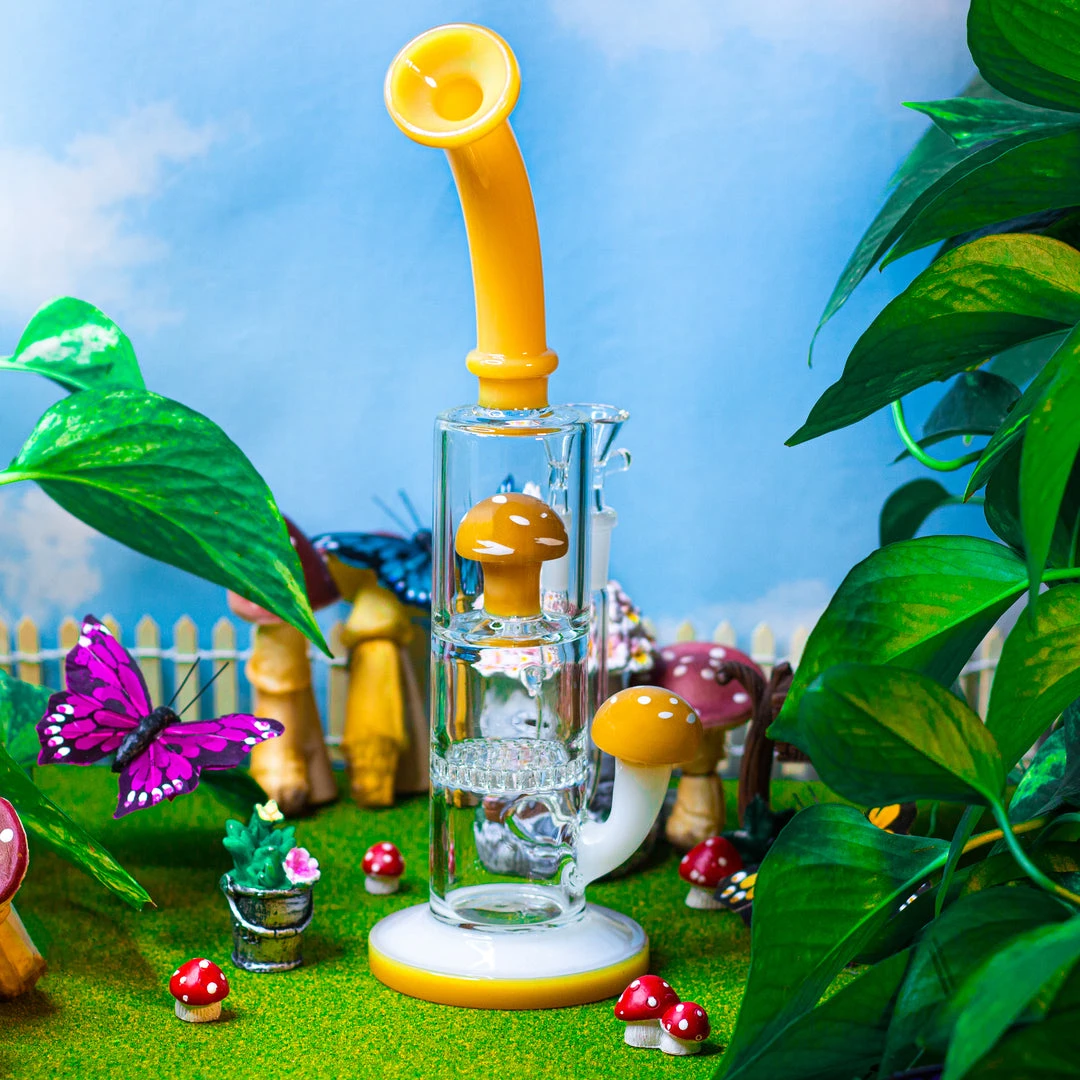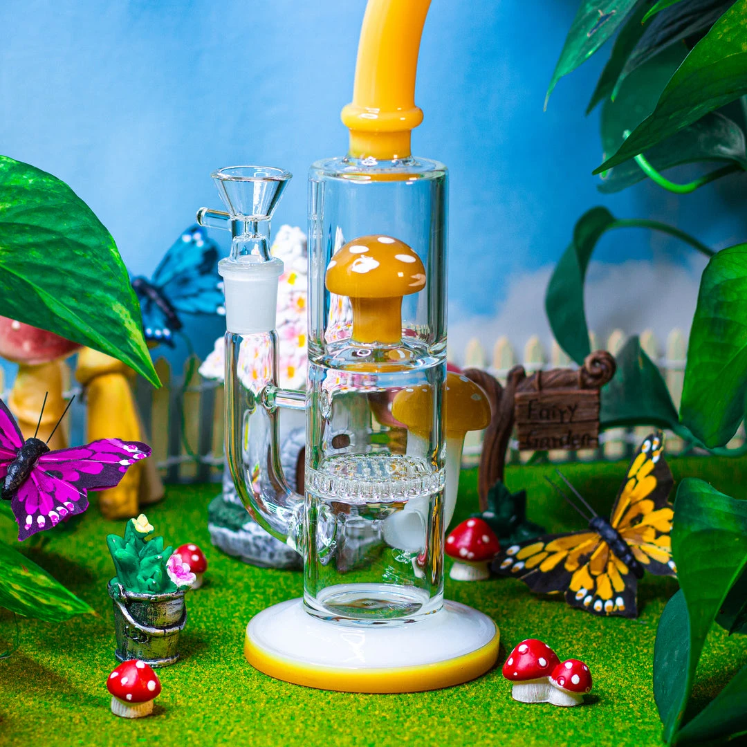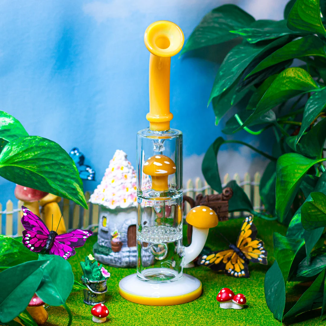 This 10.5″ beauty features a cylindrical smoke chamber and comes with not one but 2 percolators! a cute yellow mushie on top and honeycomb perc underneath! she even has an ash catcher, a curved neck, and a detailed mushroom on the side that not only looks cute but also functions as a handle. A sturdy base grounds this unique piece.
