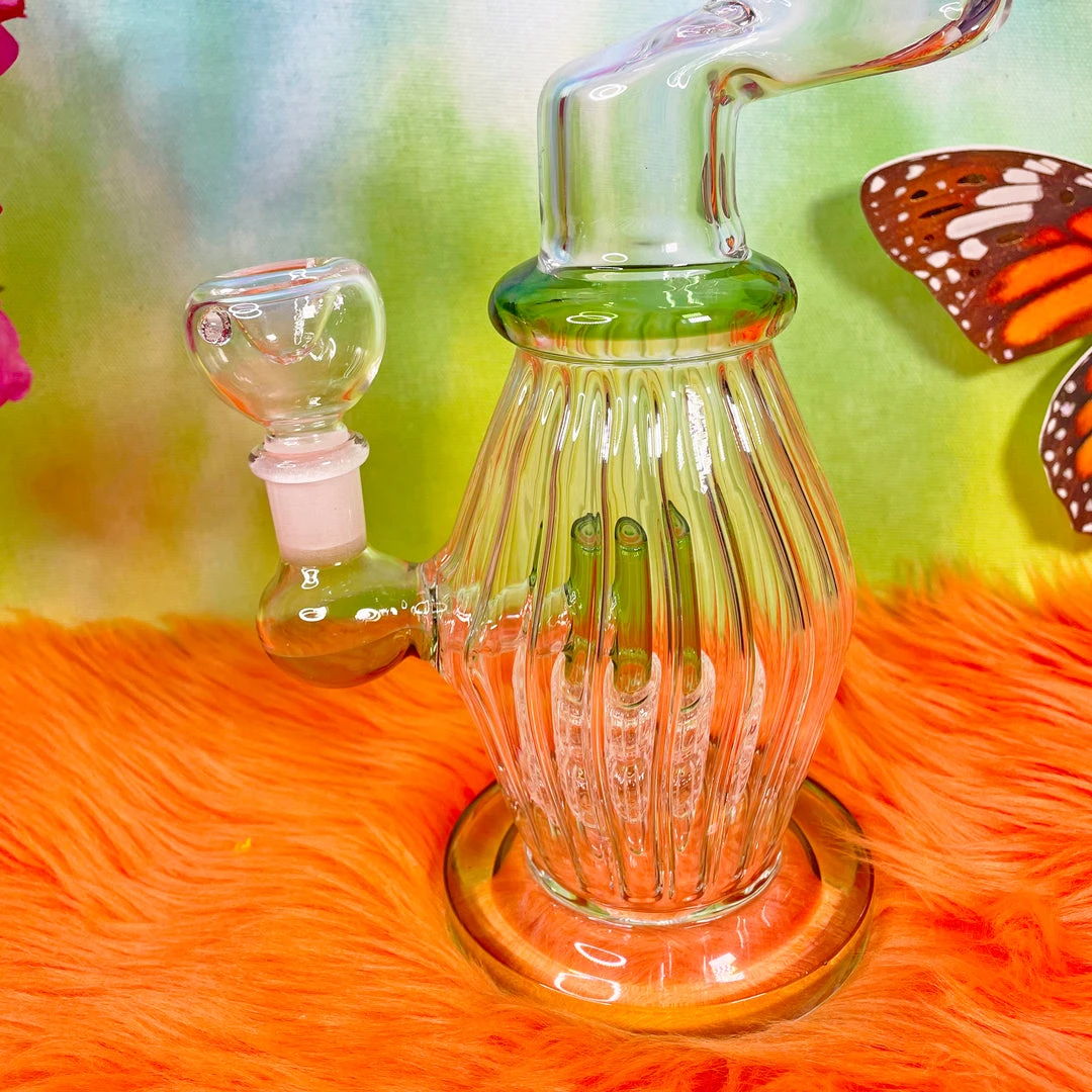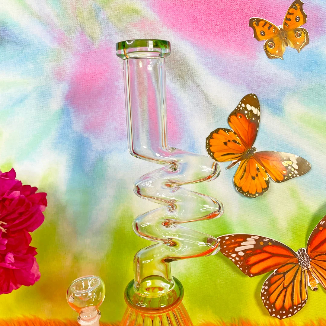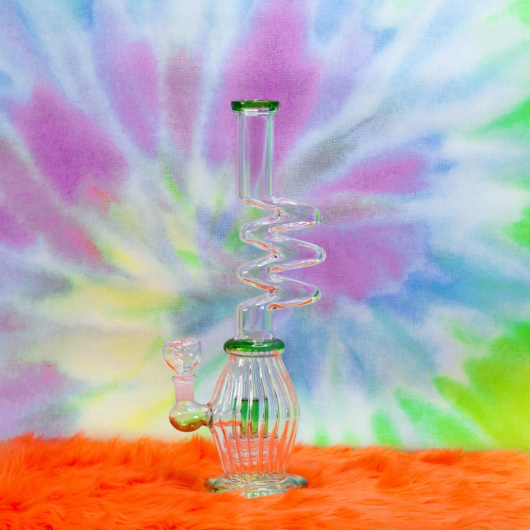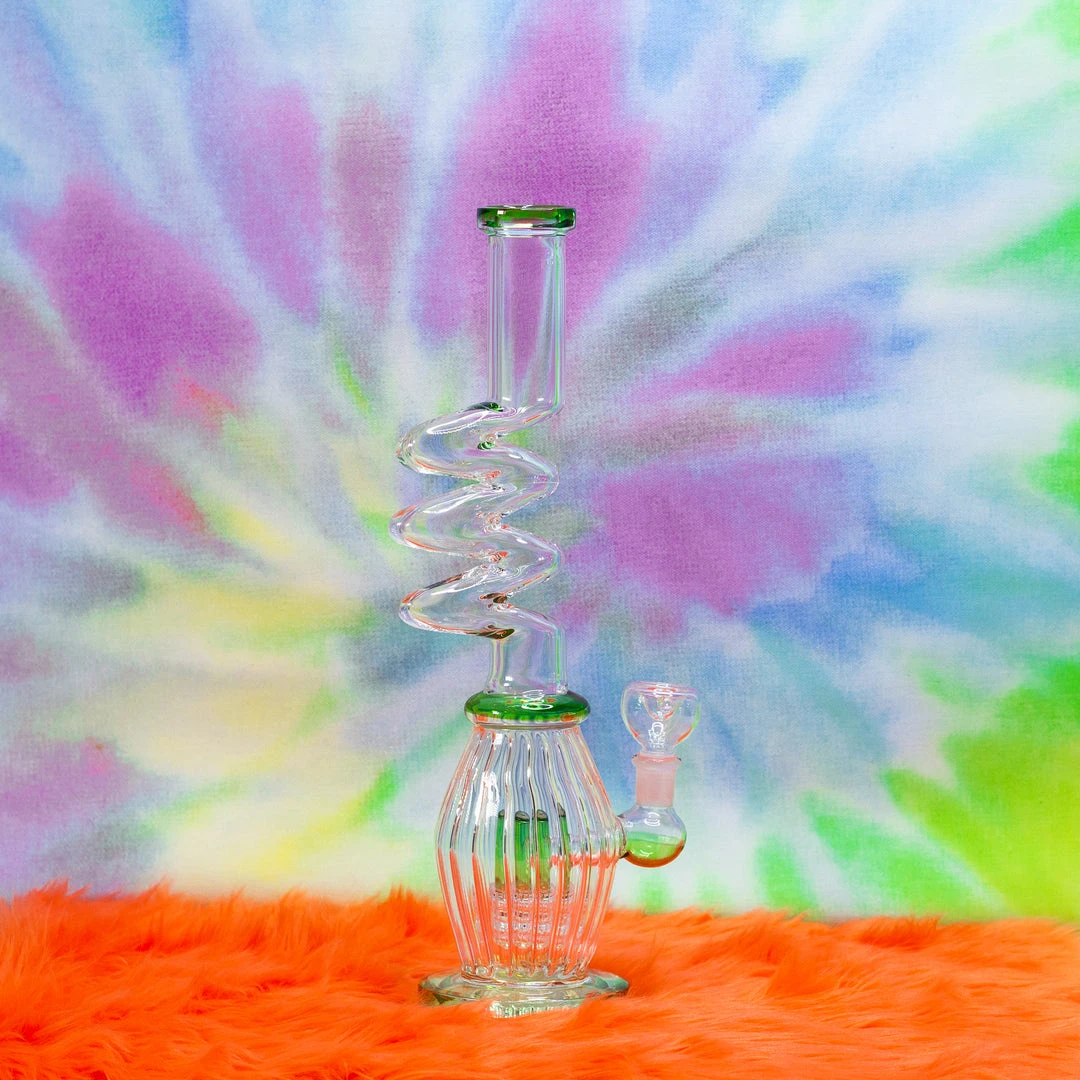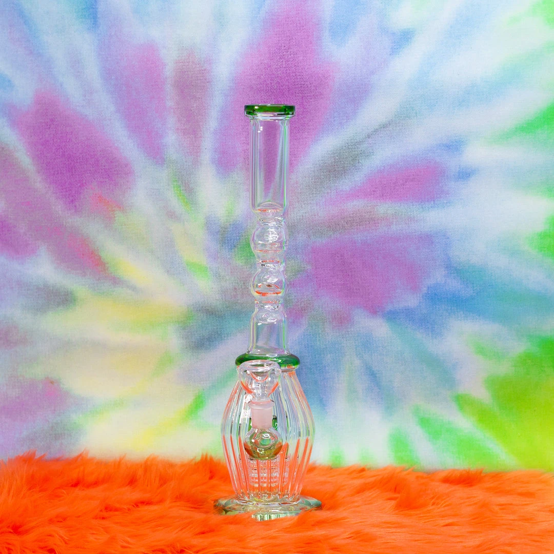 This 13″ water pipe features a a fun n funky triple zong neck (for easy grip and to reduce the chance of spillage), green accents throughout and a gorg fluted smoke chamber. Complete with an ash catcher and a chandelier perc, this babe’s got it all!