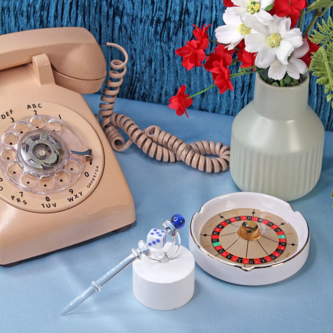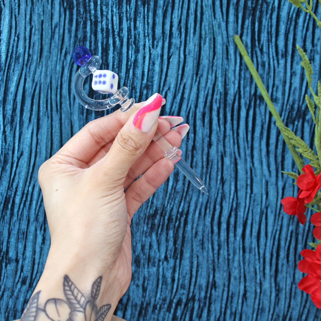 Dab tool measures 5″ and is made of clear borosilicate glass. Dice is made of white and blue glass.
