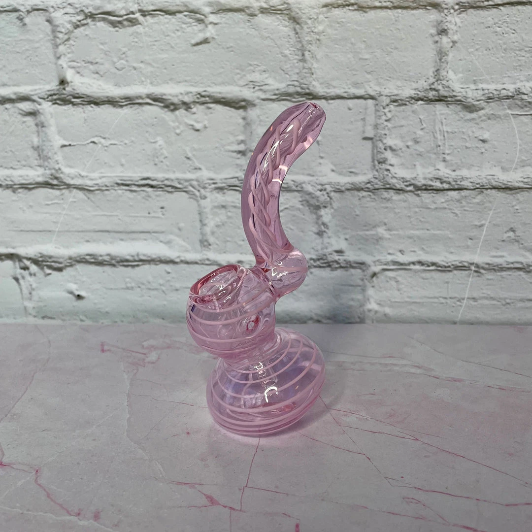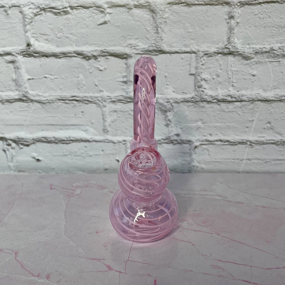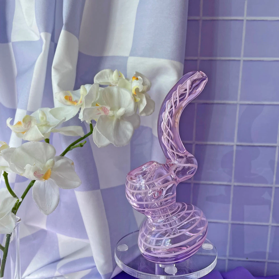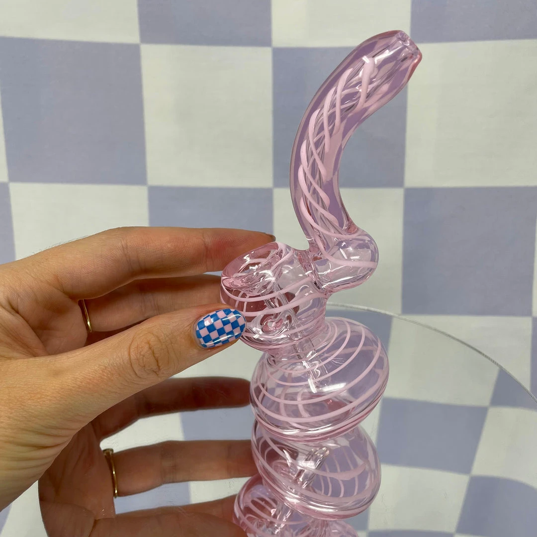The bubble buddy in pink measures just 5″ tall, making it ideal for those perfect lil puffs of joy! Featuring a delicate swirl design that stretches from the base of the bowl to the tip top, this lil cutie is sure to become your new go-to piece.